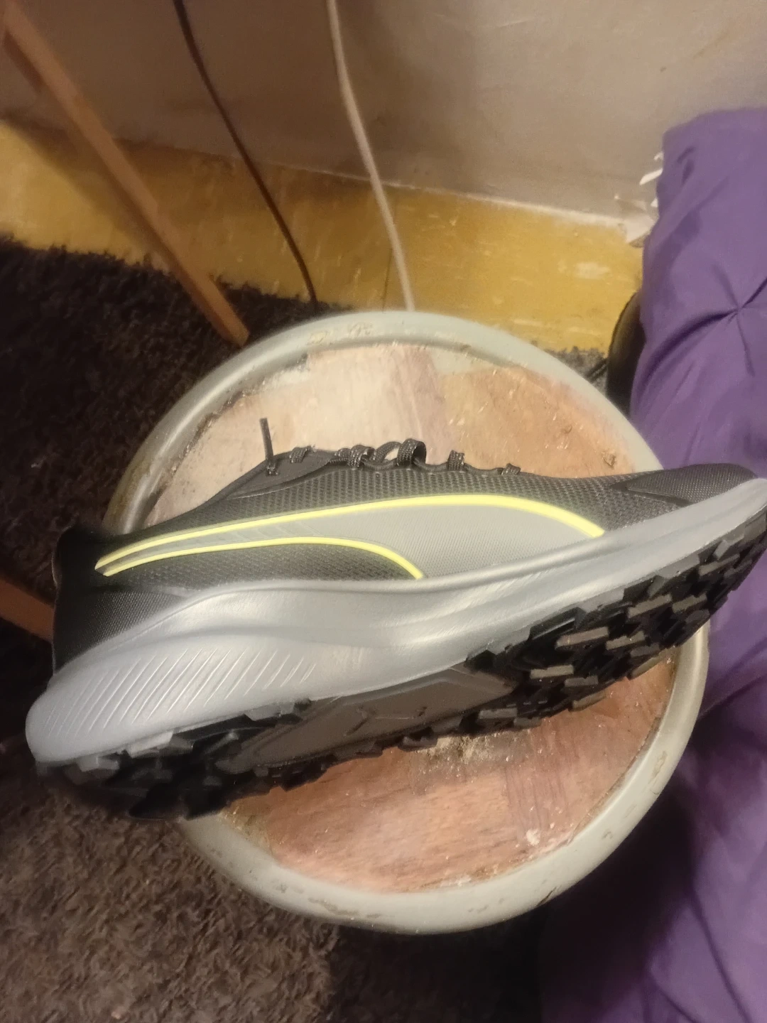 These Puma running shoes are designed for comfort and performance. The upper is a breathable mesh with a supportive grey and yellow exterior. It's a great option for daily runs or active wear.
