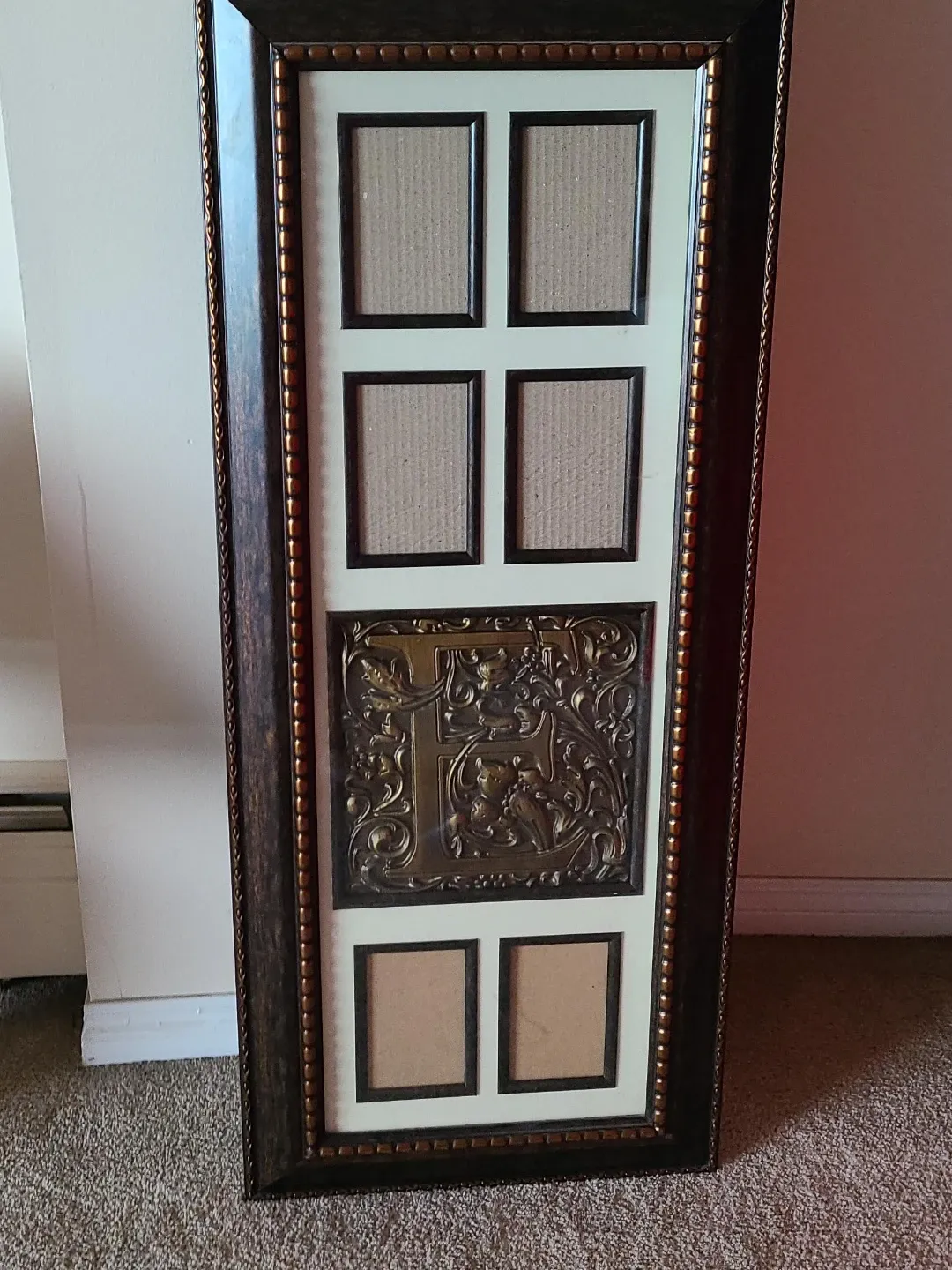 This decorative frame holds multiple photos, featuring six individual slots. It also includes an ornate, embossed metal insert with an 'E' initial. The frame itself is dark brown with gold bead detailing. Never used
