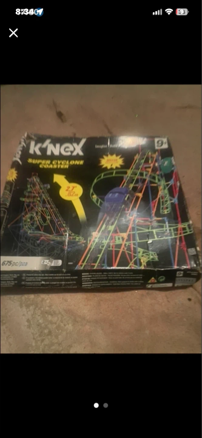 This is the K'NEX Super Cyclone Coaster building set with 675 pieces. It includes a motor for the coaster. Recommended for ages 9 and up.