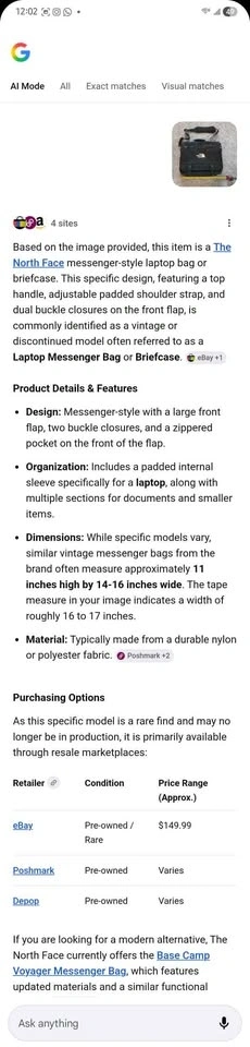 North Face laptop messenger bag. Zippers, straps, and rivets are working well, safe, and secure. Lots of pockets. Plastic part is peeling in one of the pockets. Plenty of life left in this. Great for students and business. Pick up in Buffalo Grove. Cash or Zelle pay. Check my profile for other items for sale, as I'm moving and decluttering.