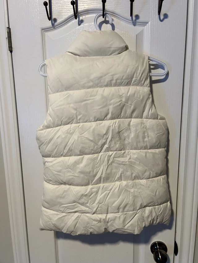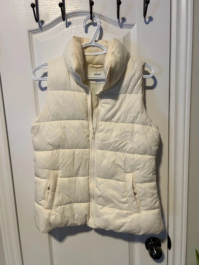 This Old Navy vest is a size extra small and perfect for layering. It's lightly padded, making it ideal for adding warmth without bulk. This vest has been previously enjoyed and is in good condition, ready to be a stylish addition to your wardrobe. Brand: Old Navy, Size: XS, Colour: Off-White. If you're seeing this ad, the vest is still available!