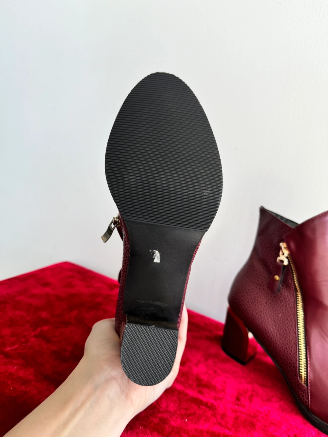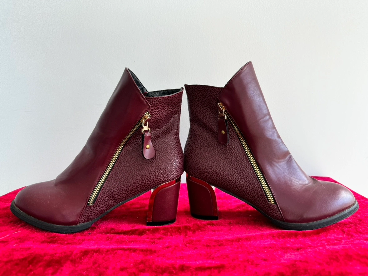 Women's burgundy ankle boots with a gold zipper detail on each side. The boots have a chunky heel.