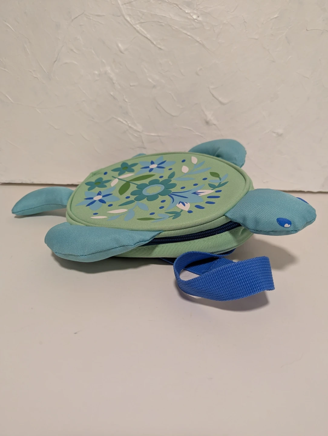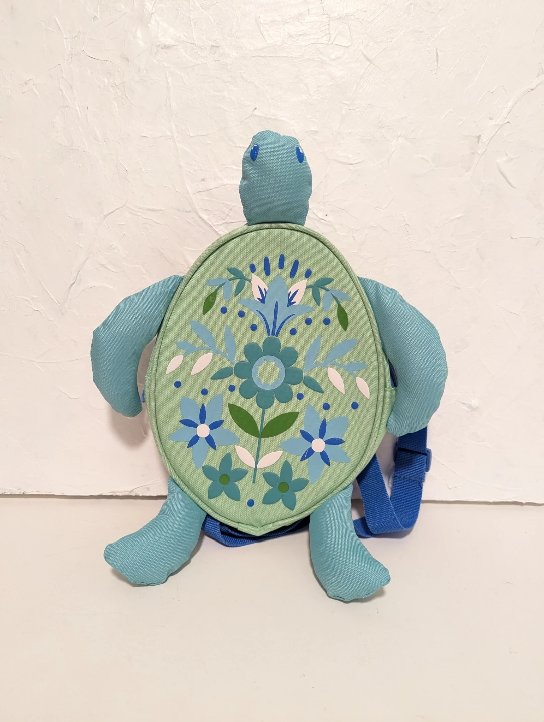 A cute turtle backpack for kids! It features a green shell with a floral design and blue straps and limbs. Perfect for carrying small items on adventures
