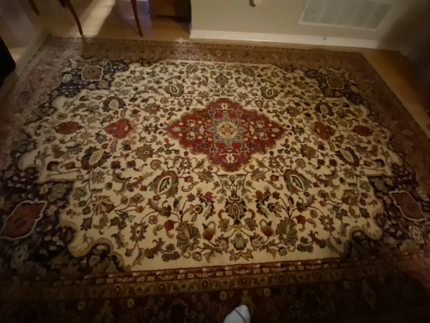 Large area rug with traditional floral pattern, ivory colour / Blue/ Red. 6'7" x 9'3".