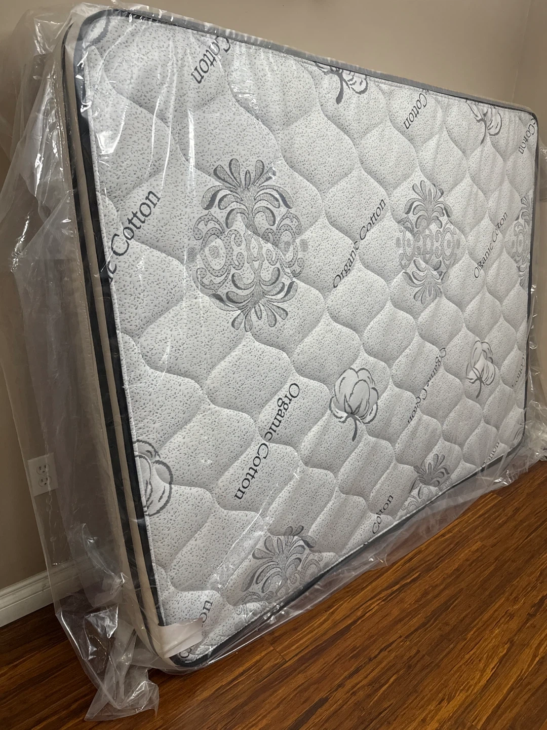 This mattress features a top layer of organic cotton. It has a quilted pattern for comfort. It's still in its original plastic wrapping. This is a great mattress for a guest room!