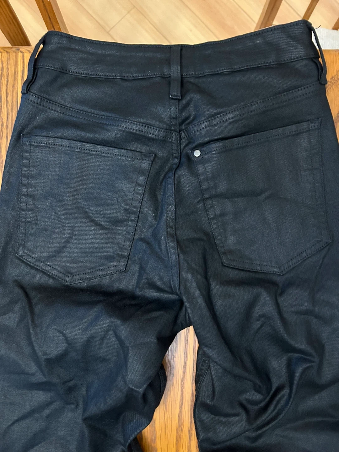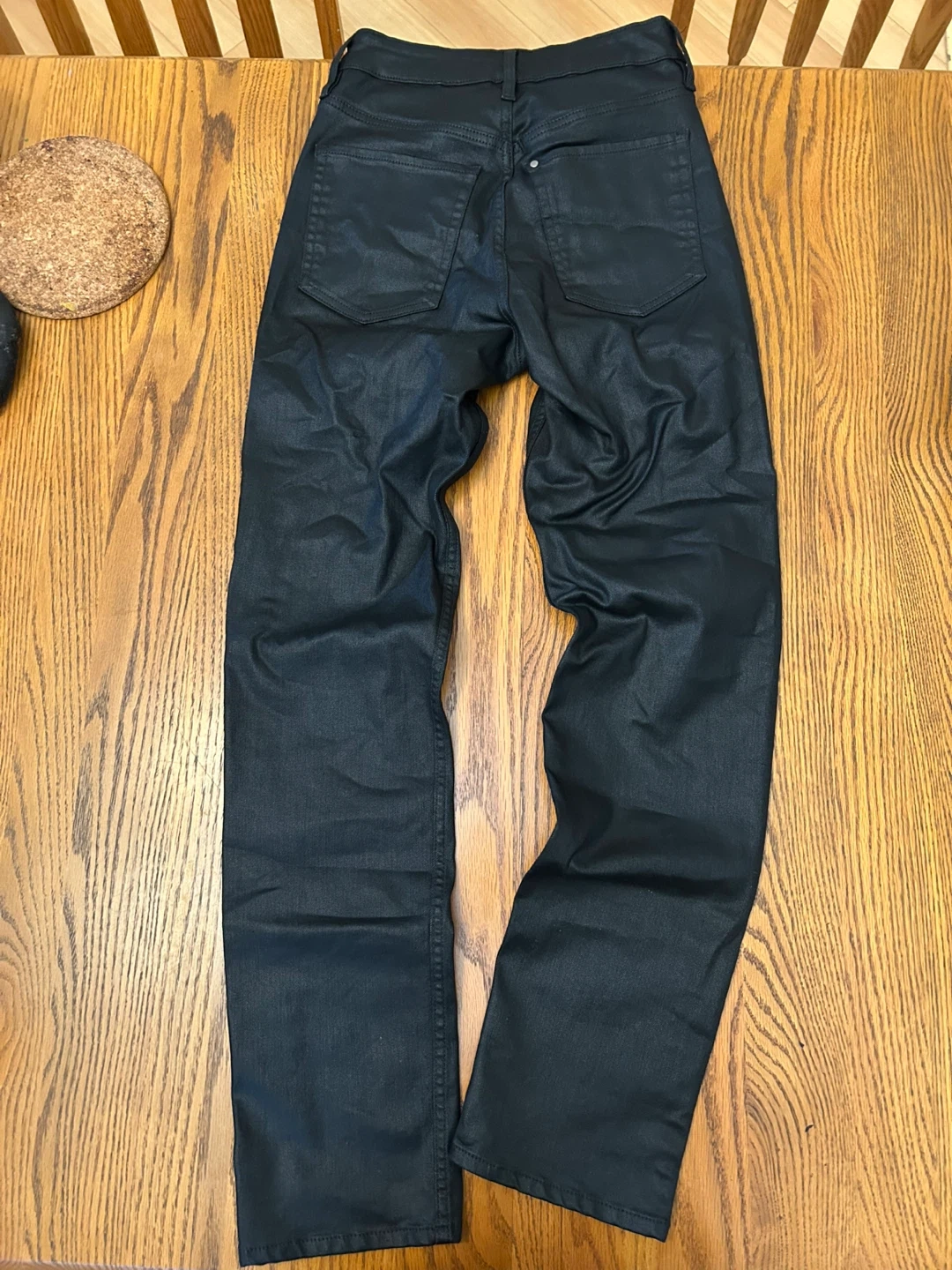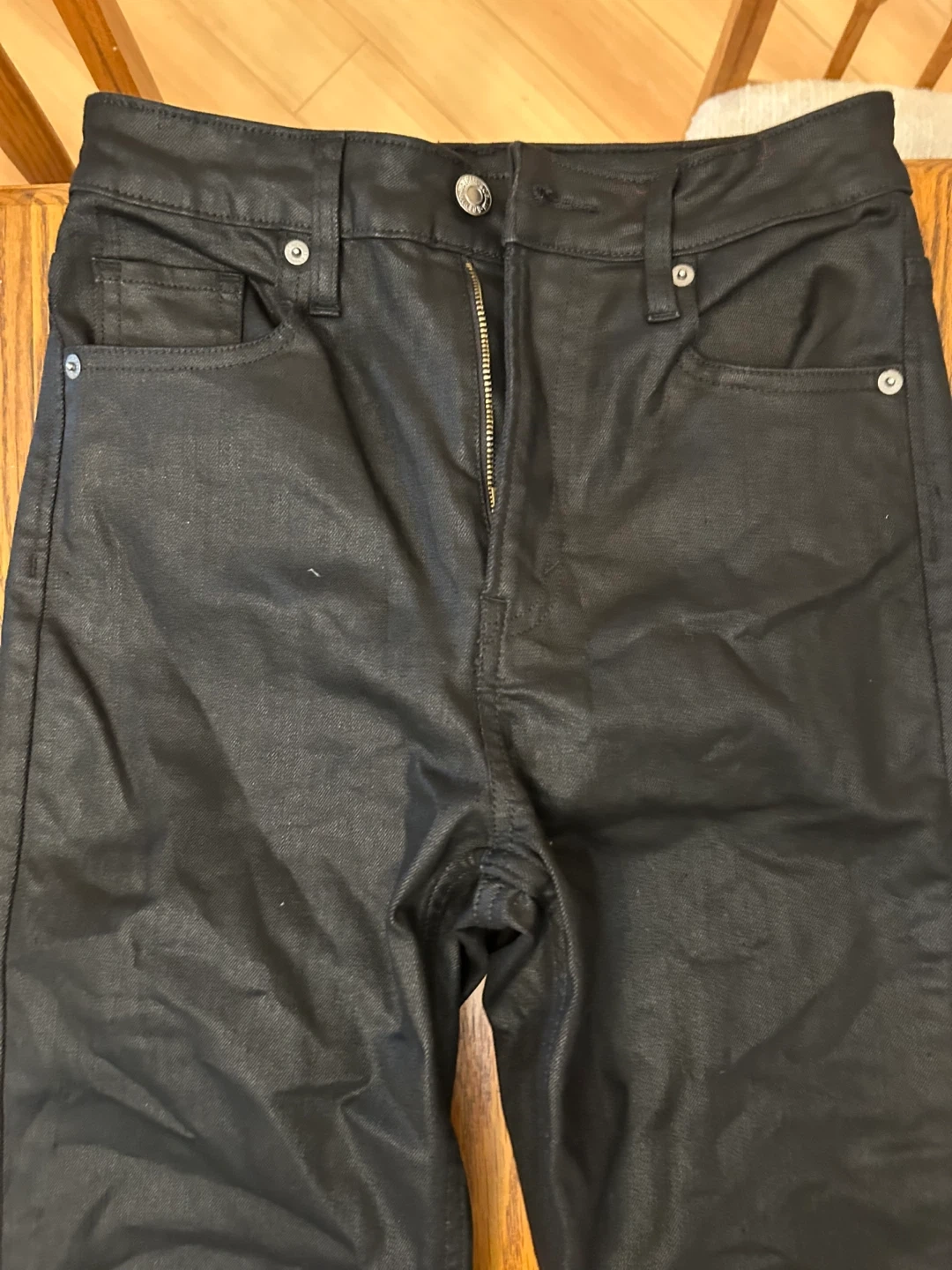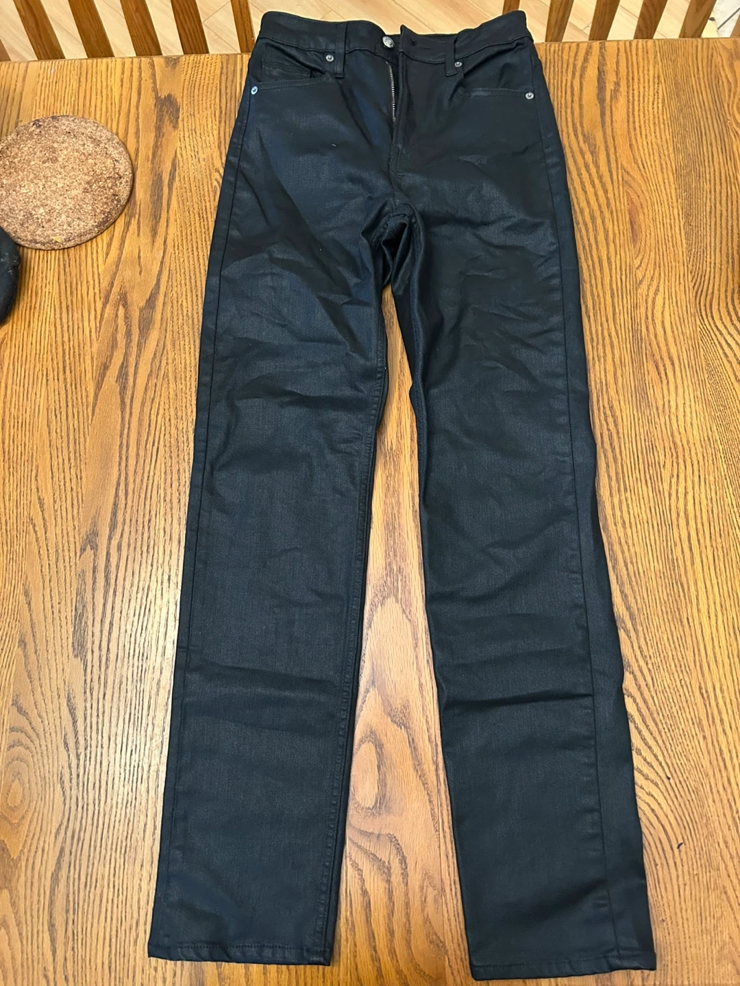 These black coated jeans have a slim fit. They're made from a durable material with a bit of stretch. The finish gives them a stylish, edgy look.