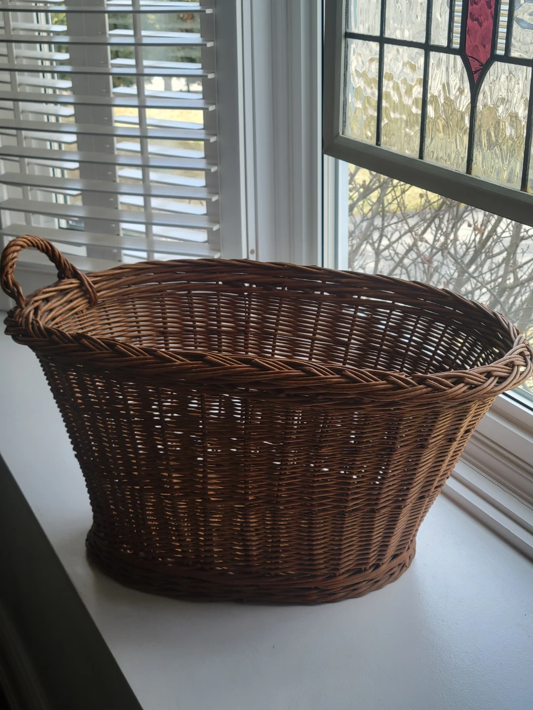 This is a lovely, large, vintage Wicker Rattan laundry basket measuring 24 inches in length, 15 inches in width, and 12 inches in height, perfect for adding a touch of rustic charm to your laundry routine.