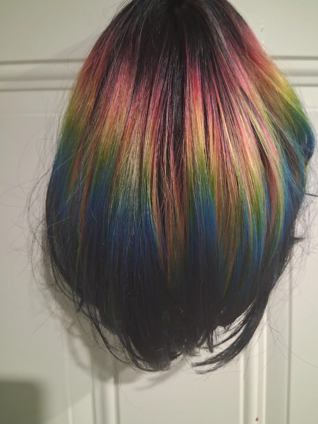 Short bob wig with rainbow stripes. Features a mix of colours including blue, green, yellow, pink, and red. Great for a fun, vibrant look!