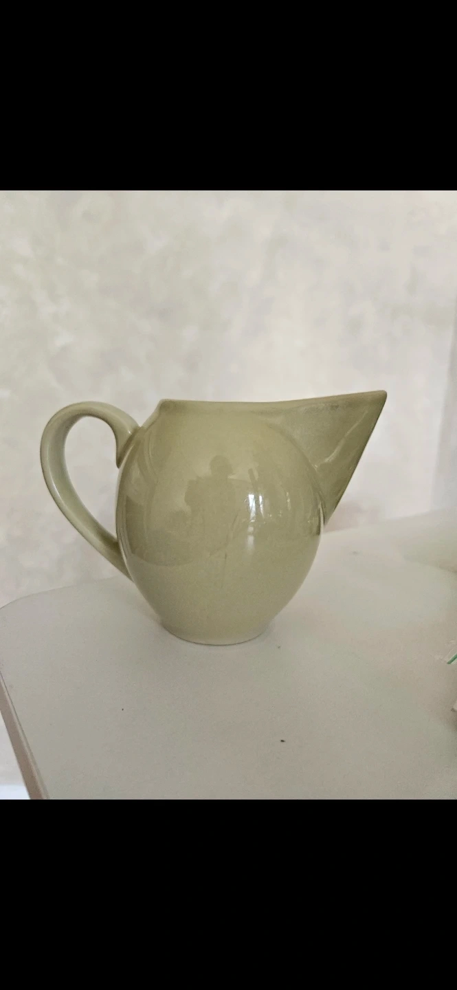 This is a light green/sage ceramic creamer pitcher. It features a handle and a distinct spout. The material is ceramic.