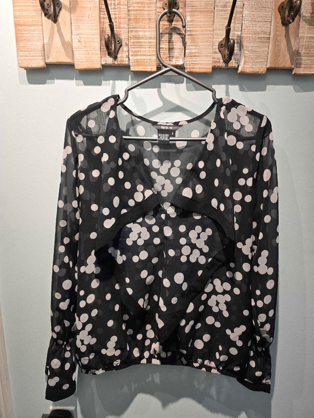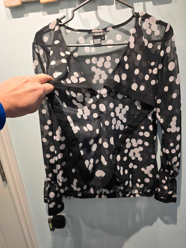This is a chic Chapter One blouse, perfect for adding a touch of elegance to any outfit, featuring a stylish black and white polka dot pattern. It's in great condition, ready to elevate your wardrobe. Additional details: * Brand: Chapter One * Size: 8 * Colour: Black and white * Material: 100% Polyester This top has plenty of life left and is just waiting for its next adventure! If the ad is up, it's available!