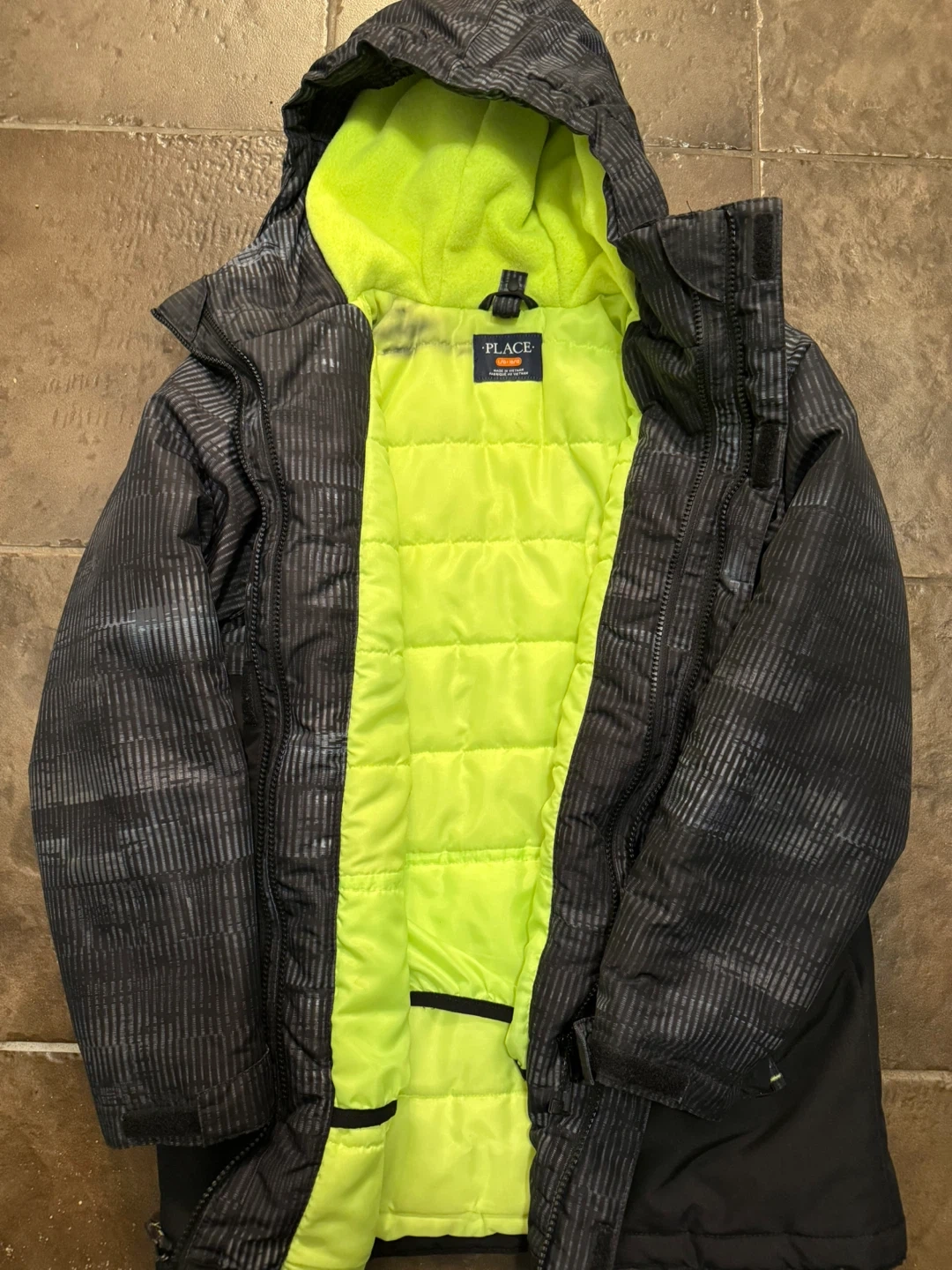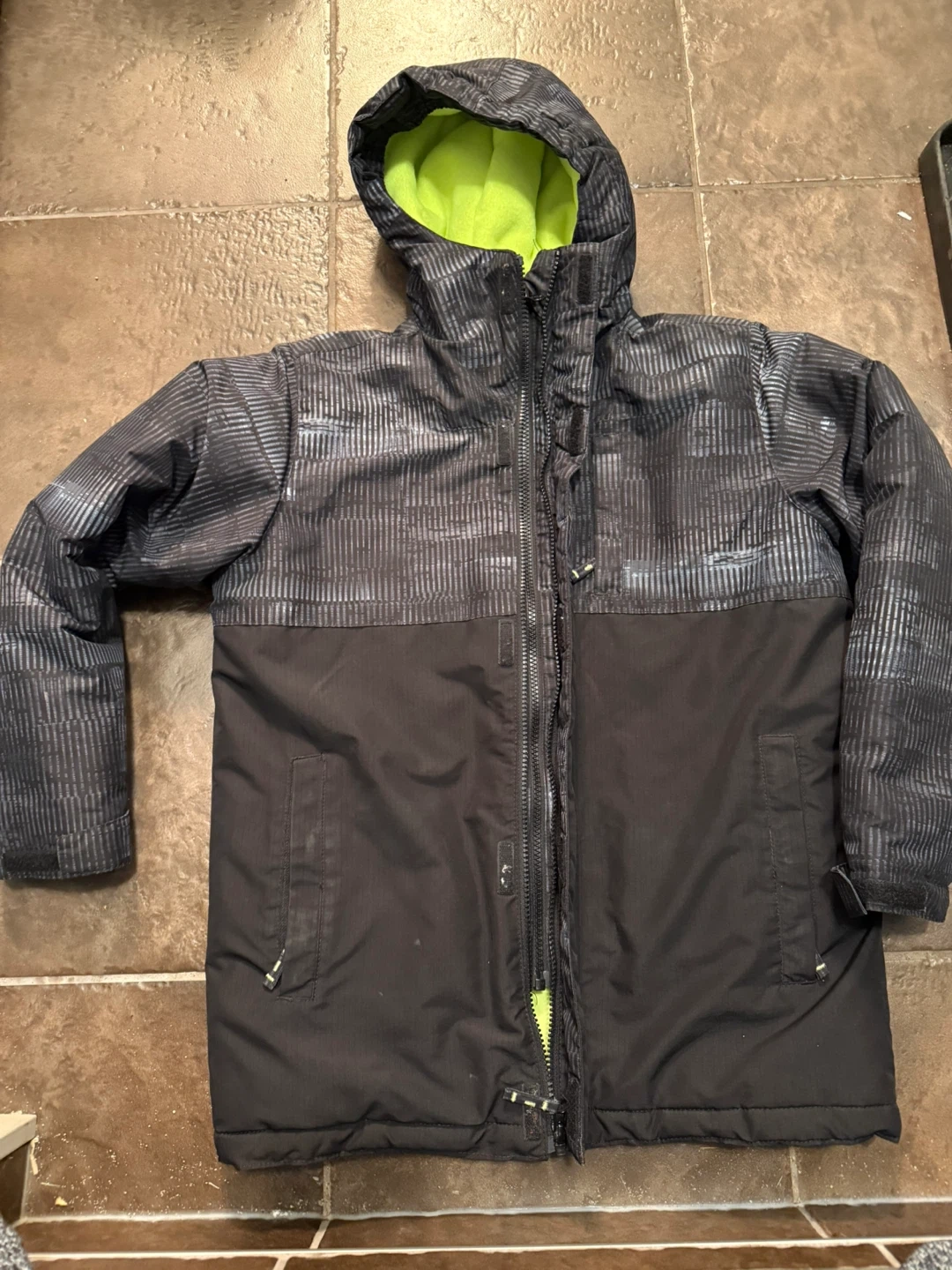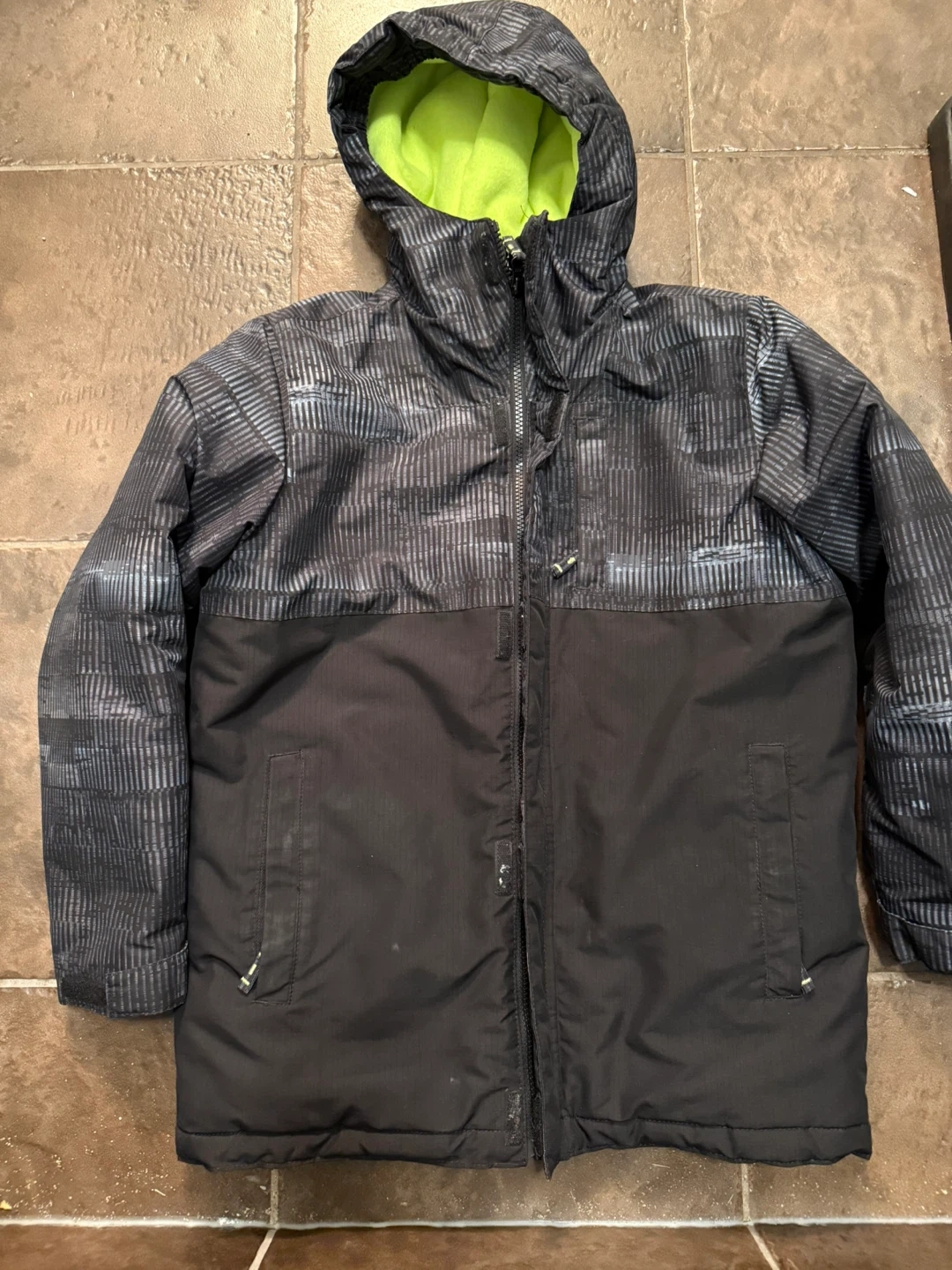 This is a boys winter jacket with a bright lime green lining. It has a full zip closure and a hood. The outer material is black with a grey patterned design.