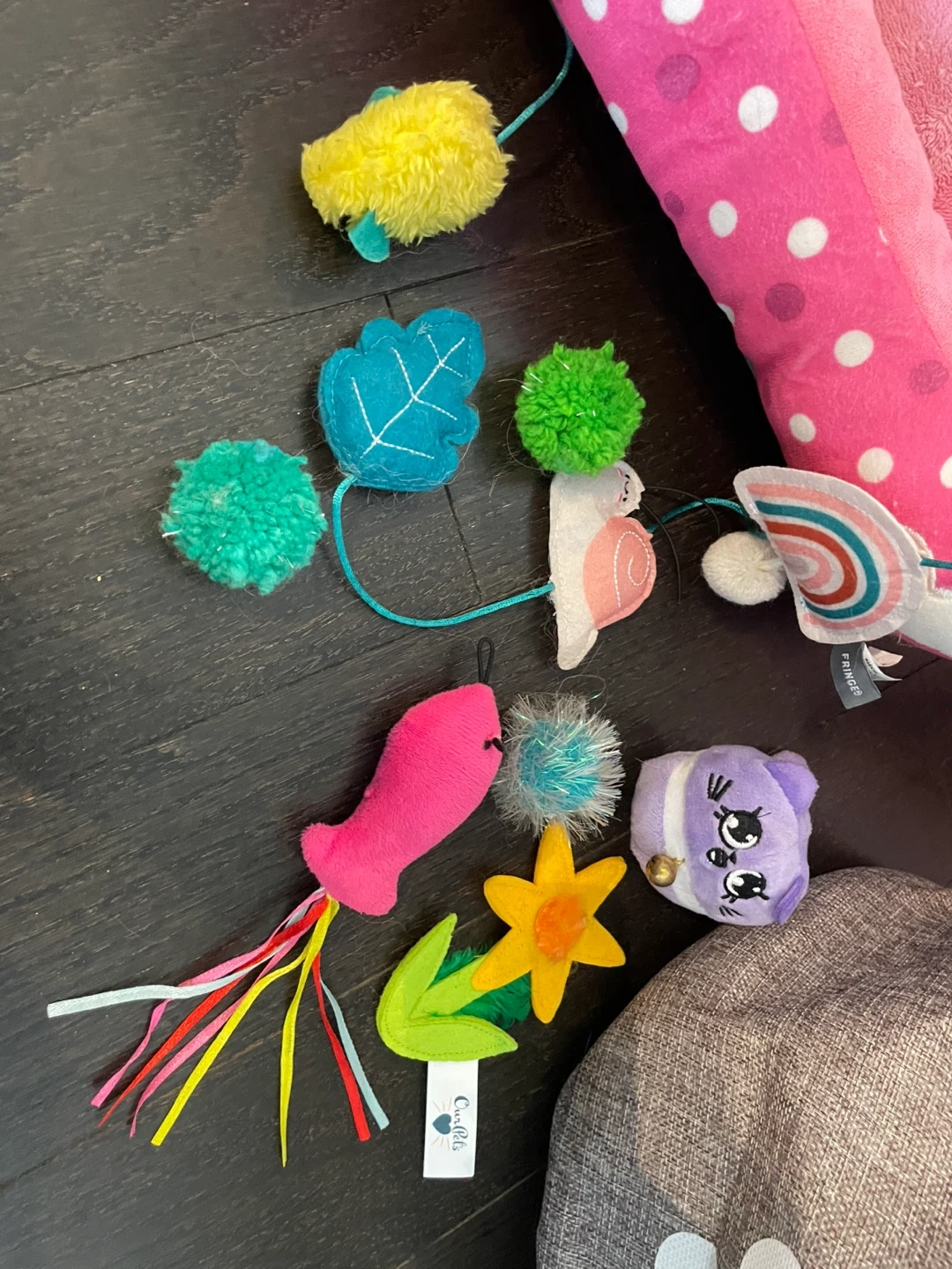 It's a fun set for your cat or kitten! Includes a pink polka dot pet bed, a heart-patterned play tent with a dangling ball, and a storage basket with a paw print design. Lots of dangly toys are also included to keep your feline friend entertained.