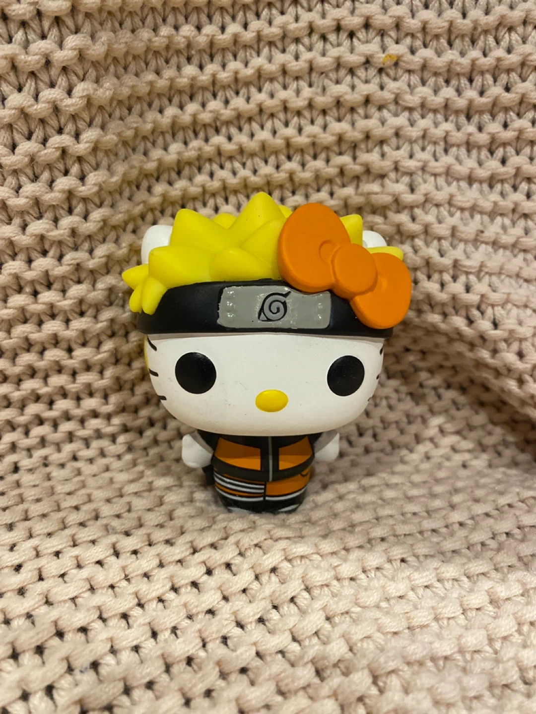 This is a Hello Kitty figure dressed as Naruto. It has the signature yellow spiky hair and orange headband with the Konoha village symbol. The figure also wears Naruto's orange and black outfit. This collectible is a fun blend of two popular franchises.