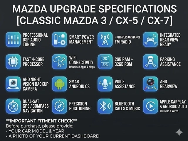 Brand new Android car stereo for Mazda 3, CX-5, CX-7, and Mazda 5. Adds modern features like CarPlay and Android Auto. Features a clear and bright 1280x720 HD QLED screen. Comes with 2GB RAM + 32GB ROM, wireless/wired CarPlay & Android Auto, WiFi, and Bluetooth. Built-in DSP for great sound quality. Includes a rear-view backup camera and all necessary wiring. Compatible with Mazda 3 (2008-2013), CX-5 (2013-2015), CX-7 (General), Mazda 5 (2011-2013), etc. Please provide your car's model and year before purchasing so I can confirm fitment. New.
