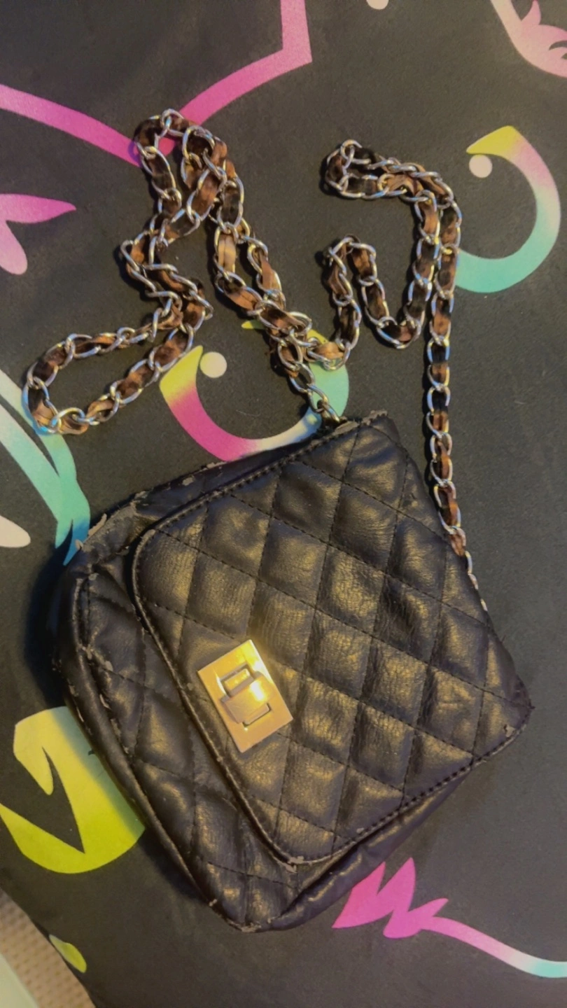 Small black crossbody bag. Features a quilted design and a chain strap with leopard print accents. Gold-toned hardware.