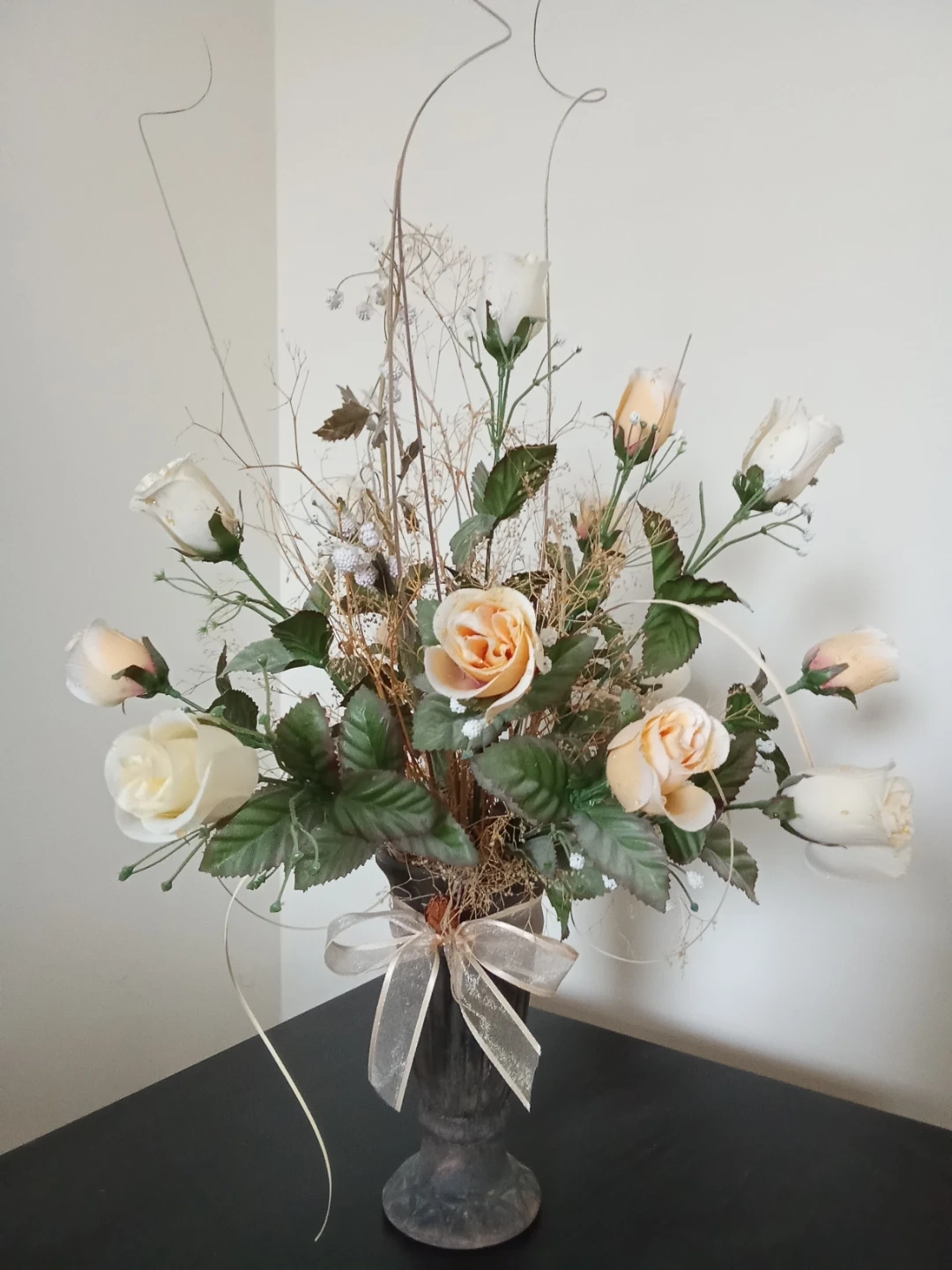This arrangement features artificial roses in cream and peach hues, accented with dried filler and greenery. It's presented in a dark, urn-style vase tied with a sheer ribbon. A lovely decorative piece for any room!