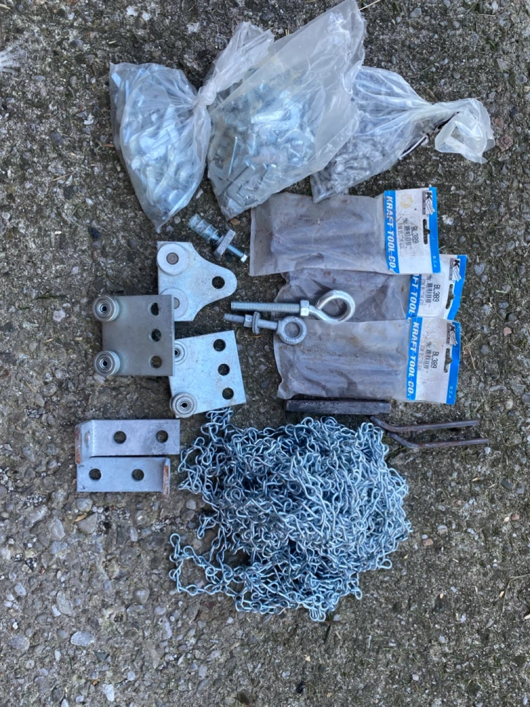 Selling a mixed lot of hardware items. Includes chain, various brackets, bolts, and other fasteners. Great for DIY projects or repairs!
