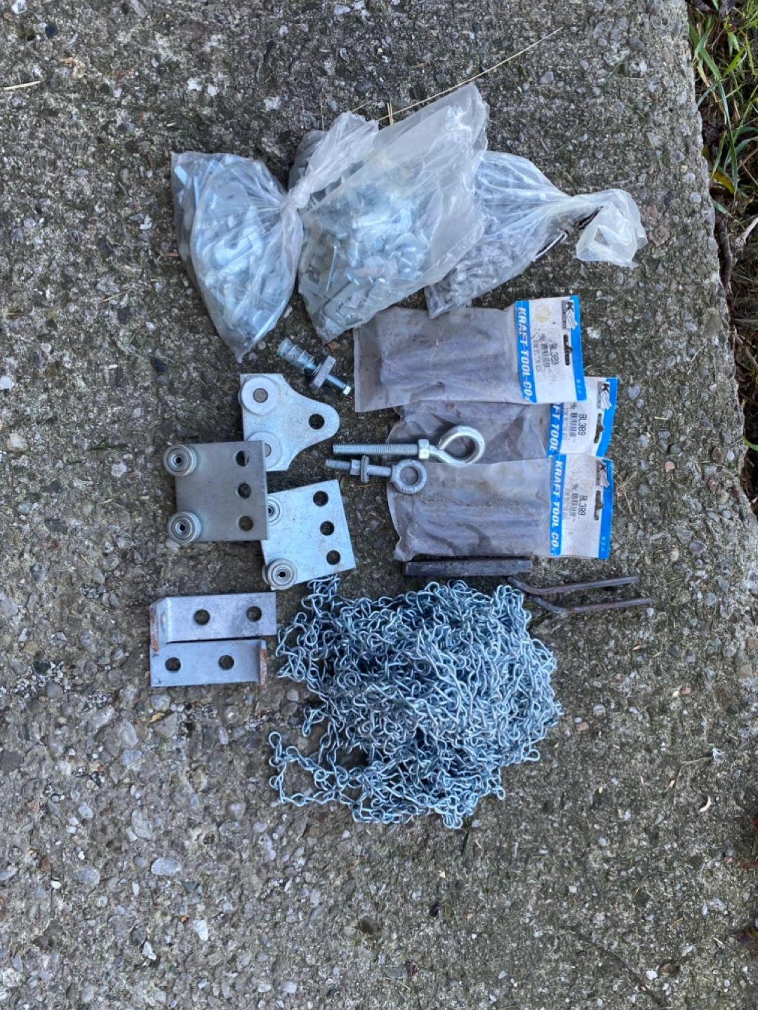 Selling a mixed lot of hardware items. Includes chain, various brackets, bolts, and other fasteners. Great for DIY projects or repairs!