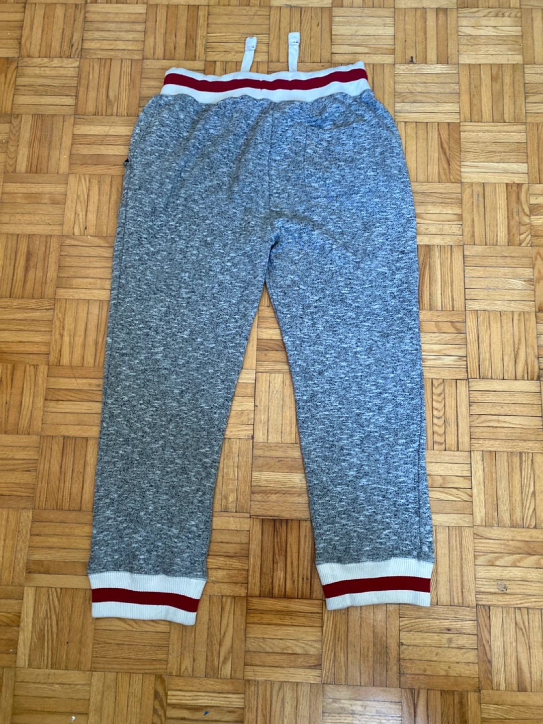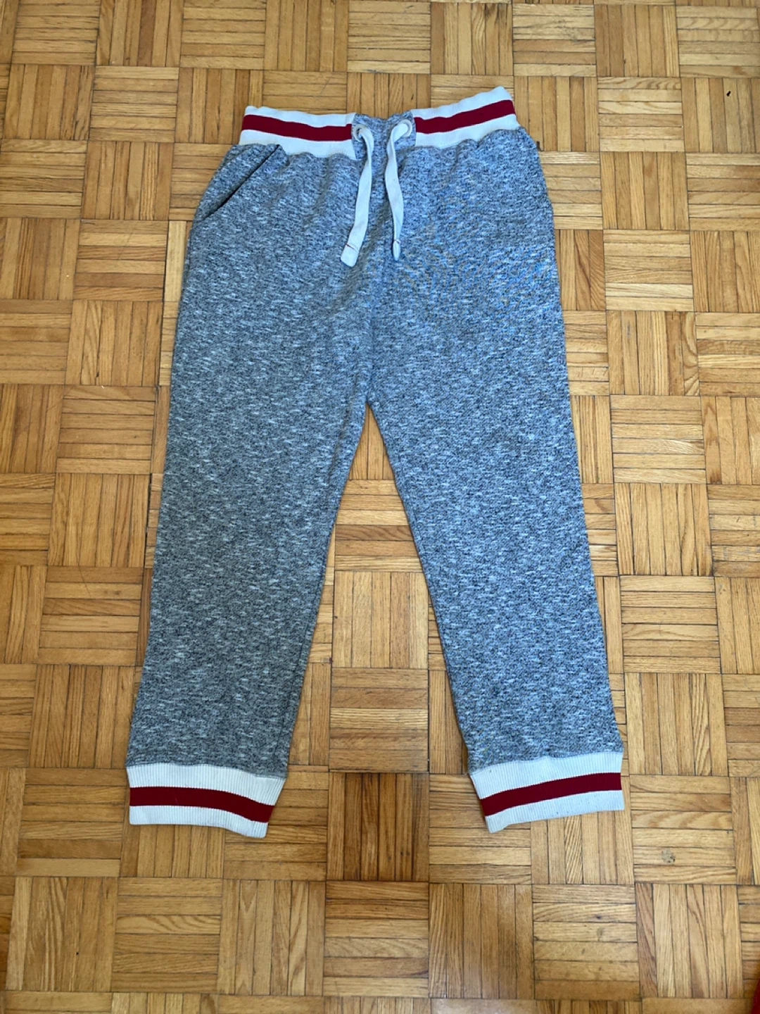 These CAVIN FEVER joggers are grey and come in size XL/TG. They feature a drawstring waist and cuffed ankles with red and white stripes. Perfect for casual wear!