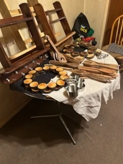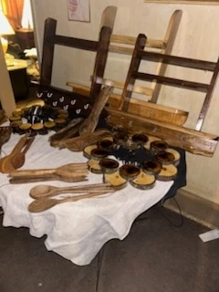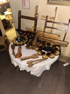This is a collection of handmade wooden kitchen utensils and decorative items. It includes various spoons, forks, and circular wooden pieces with cups. Great for adding a rustic touch to your kitchen or for serving appetizers! As well as spice racks and wooden puck wreaths.