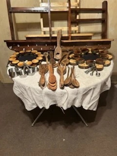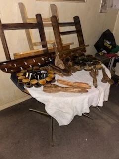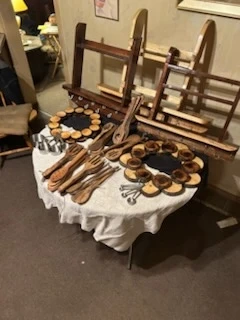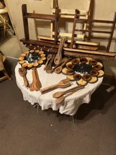 This is a collection of handmade wooden kitchen utensils and decorative items. It includes various spoons, forks, and circular wooden pieces with cups. Great for adding a rustic touch to your kitchen or for serving appetizers! As well as spice racks and wooden puck wreaths.
