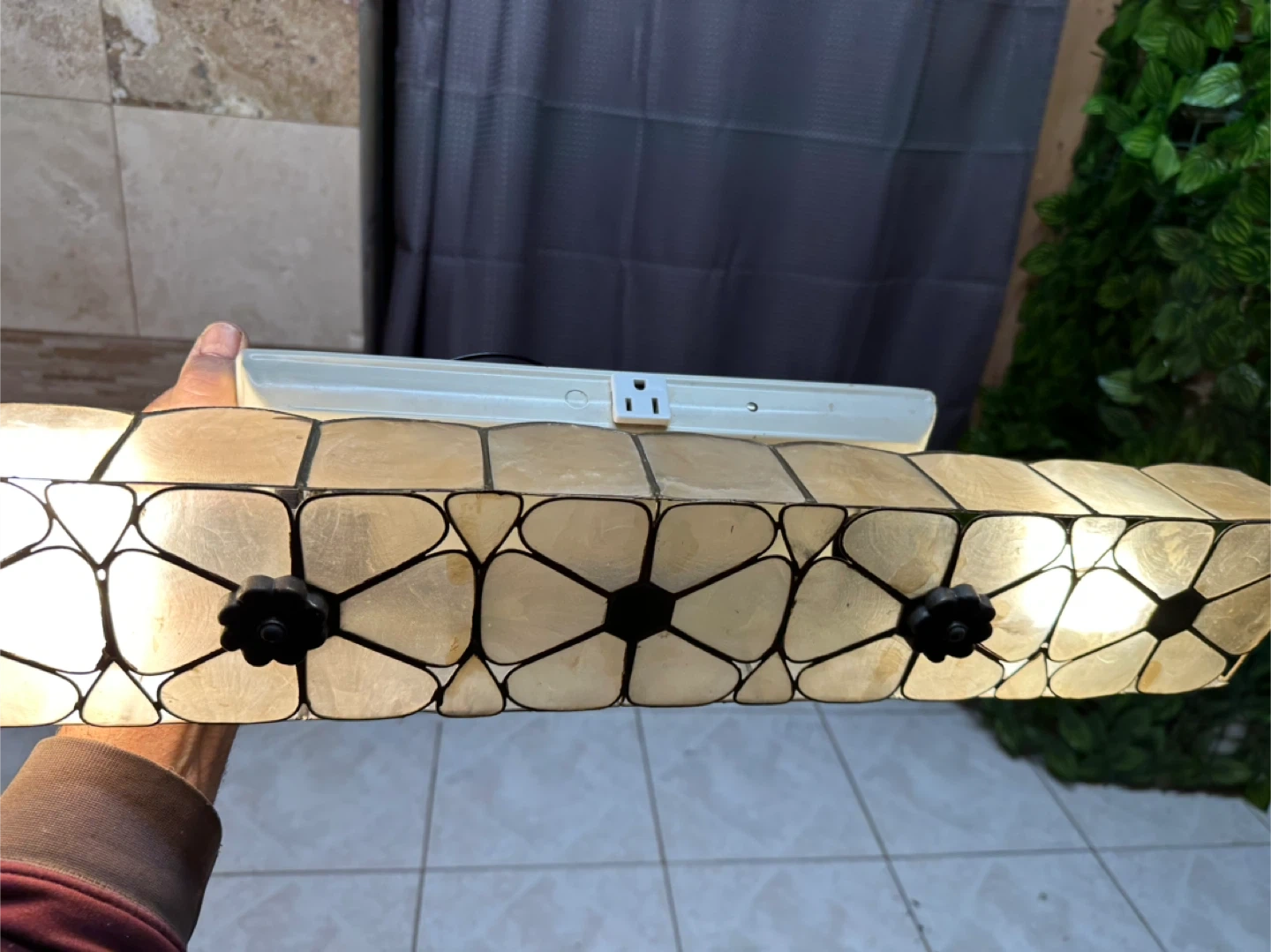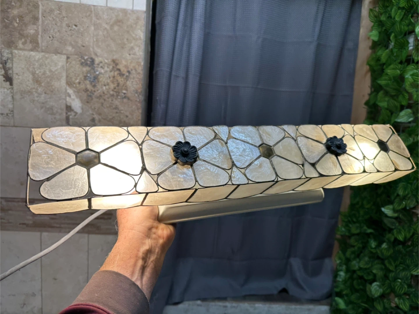 A unique vanity light fixture with a capiz shell shade, featuring a decorative floral pattern. It's designed to be mounted above a mirror.