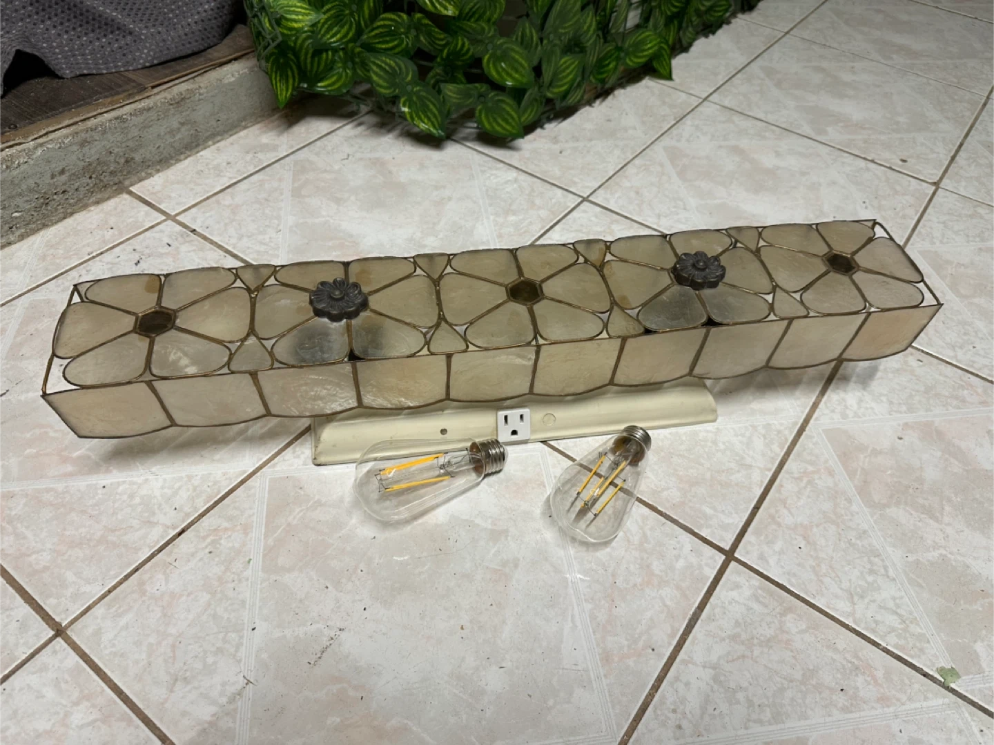 A unique vanity light fixture with a capiz shell shade, featuring a decorative floral pattern. It's designed to be mounted above a mirror.
