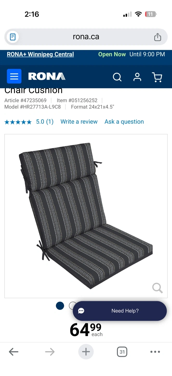 This is a RONA chair cushion. It's a dark grey colour with a striped pattern. The dimensions are 24 inches by 21 inches by 4.5 inches. Qty 4 used for 1 short season, changing colours, price per retails for $75 w/tax