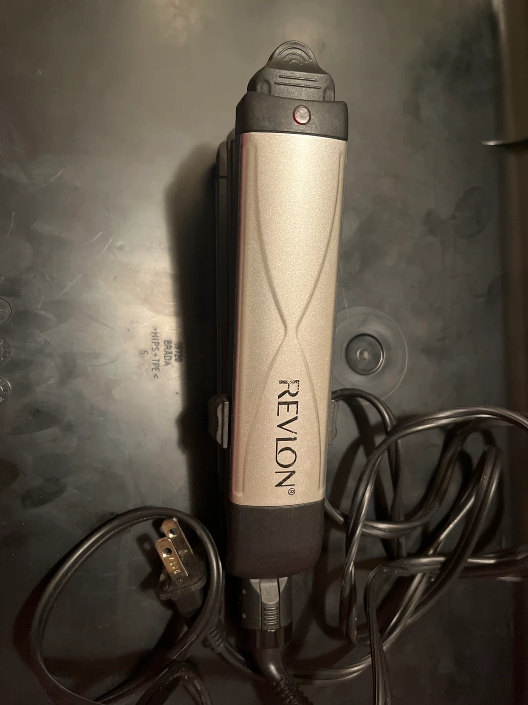 Revlon hair straightener with a silver and black finish. It features a power cord for easy use. Great for quick touch-ups on the go!