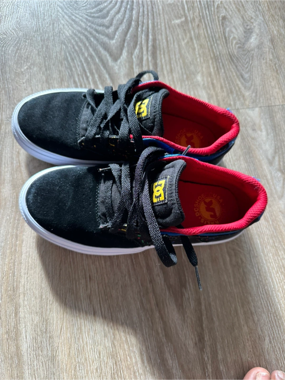These DC shoes are black with a suede upper and a red interior lining. They feature a colourful splatter design on the side and have grippy green outsoles with the DC logo. Great for skateboarding!