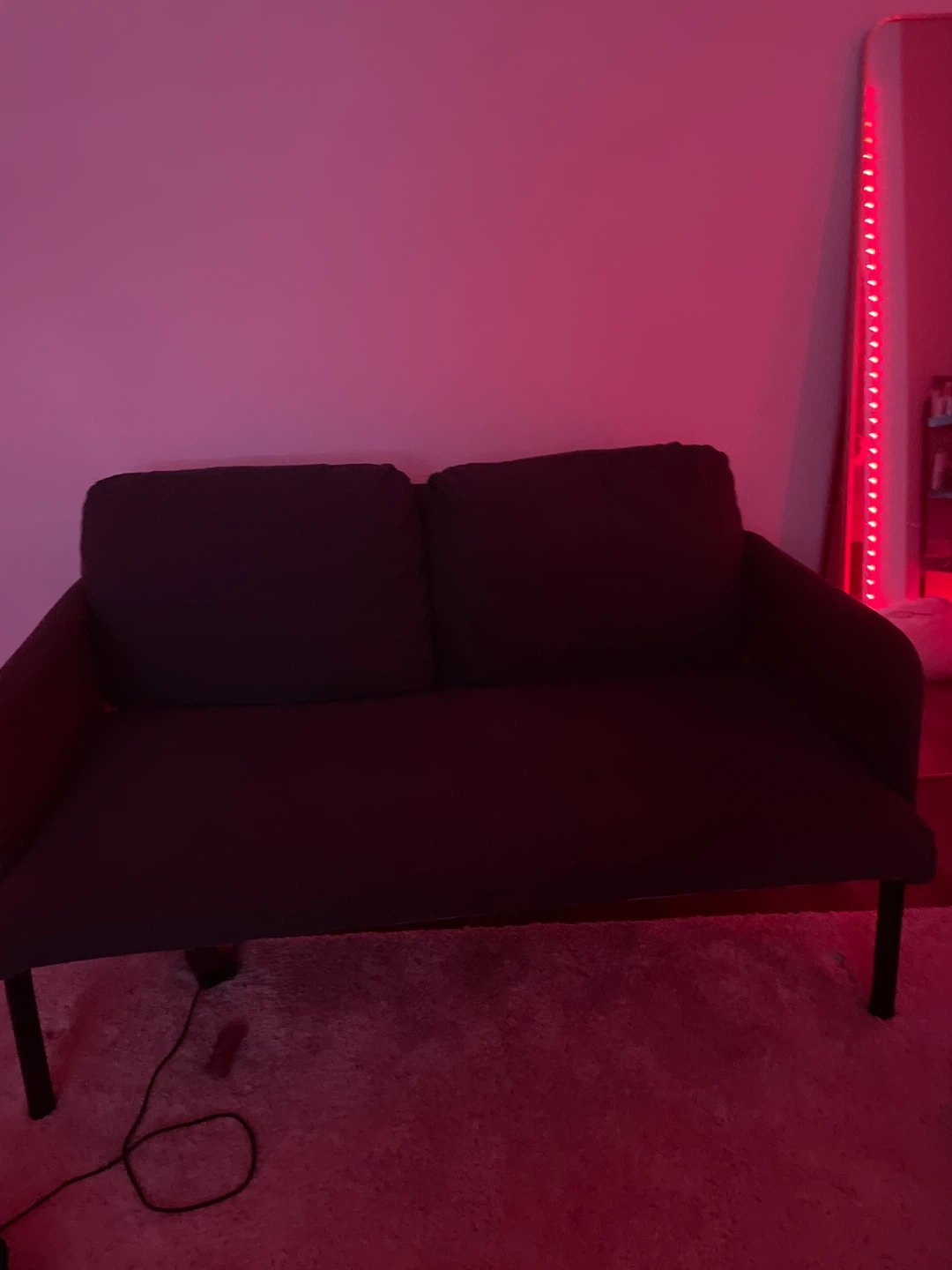 A dark grey loveseat sofa with two seat cushions and two back cushions. It has black metal legs and fabric upholstery. This sofa would fit well in a smaller living space or apartment. I will have the couch professionally cleaned so it’s good as brand new.