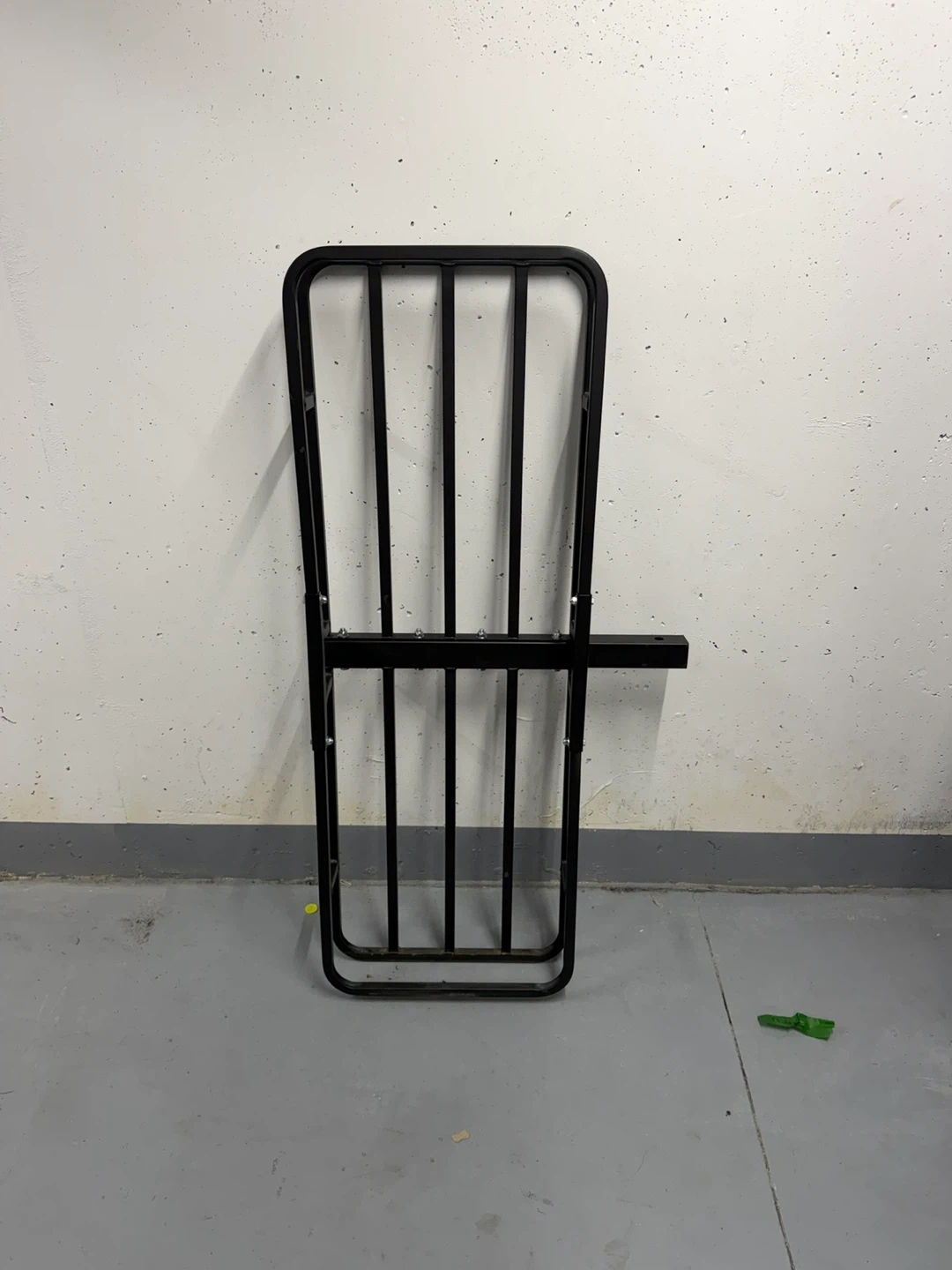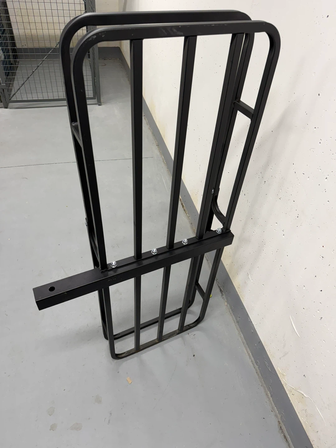 This is a Motomaster hitch mount cargo carrier. It's made of black metal. This carrier is useful for transporting extra gear on your vehicle.