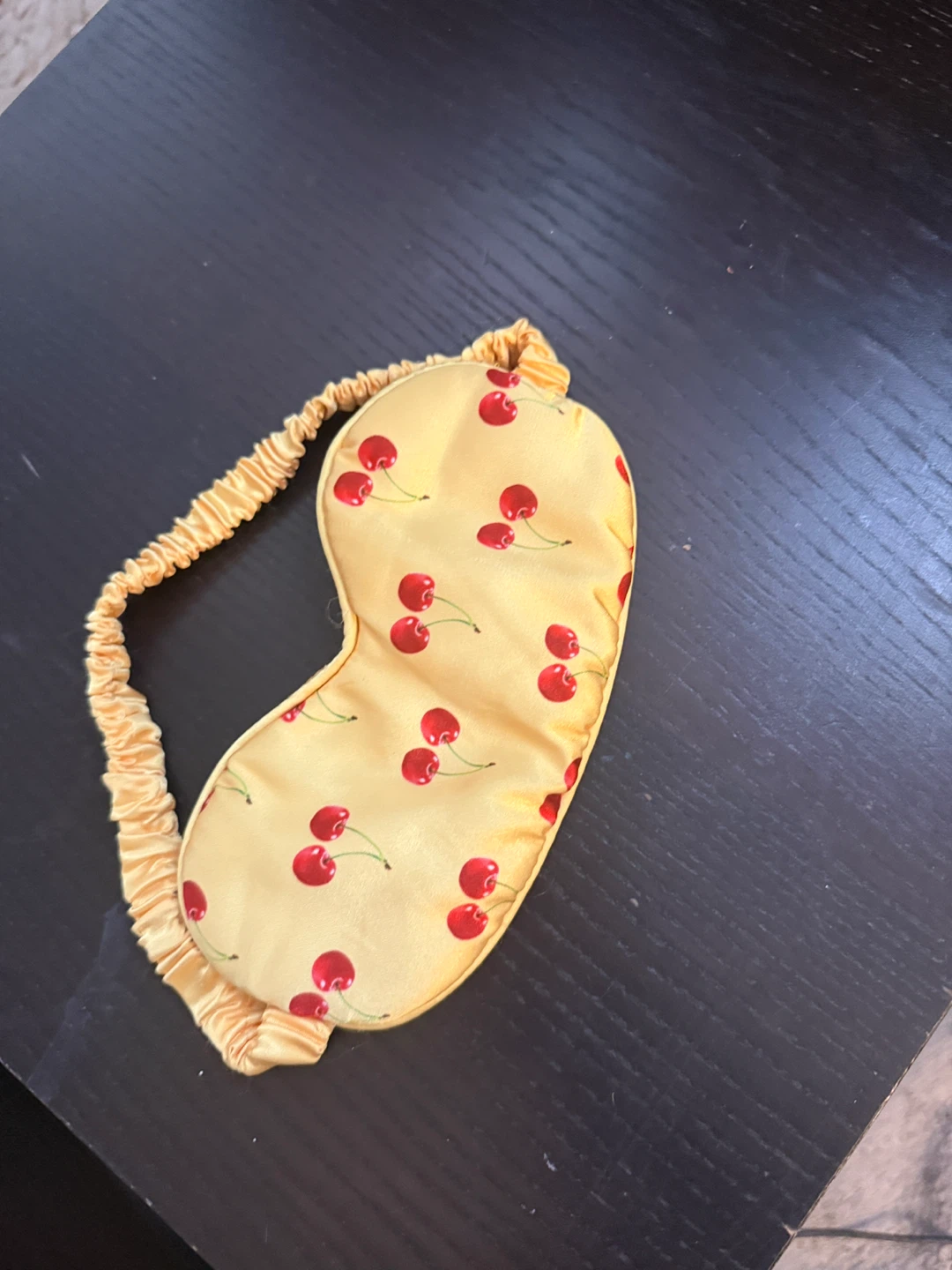 A fun sleep mask with a yellow background and a repeating cherry pattern. It features a comfortable elastic strap for a secure fit. Perfect for blocking out light for a restful sleep!