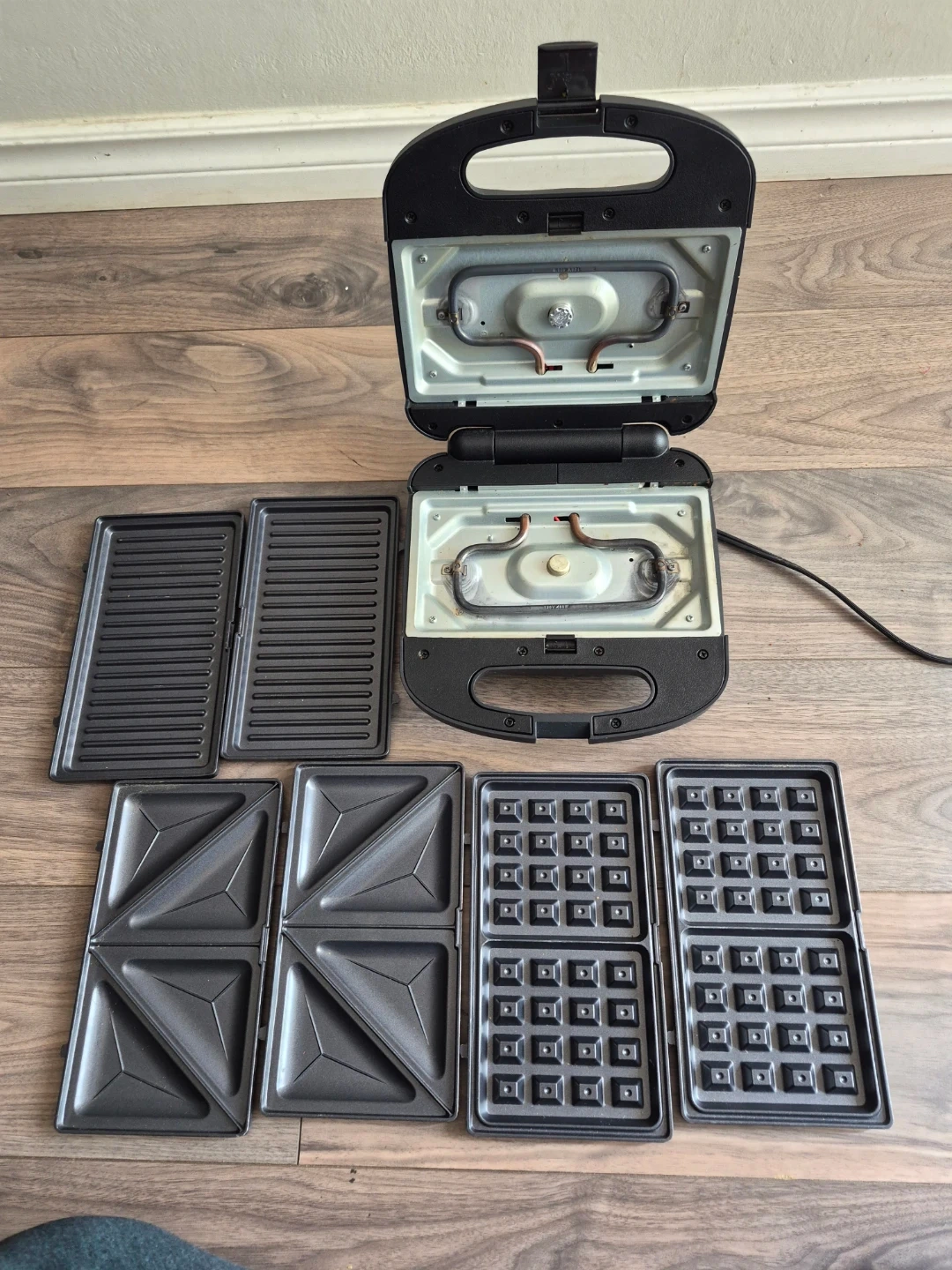 This Salton SM1543 is a versatile sandwich maker, grill, and waffle maker. It comes with four sets of interchangeable plates for different cooking needs. Plate sets include sandwich, grill, and waffle designs.