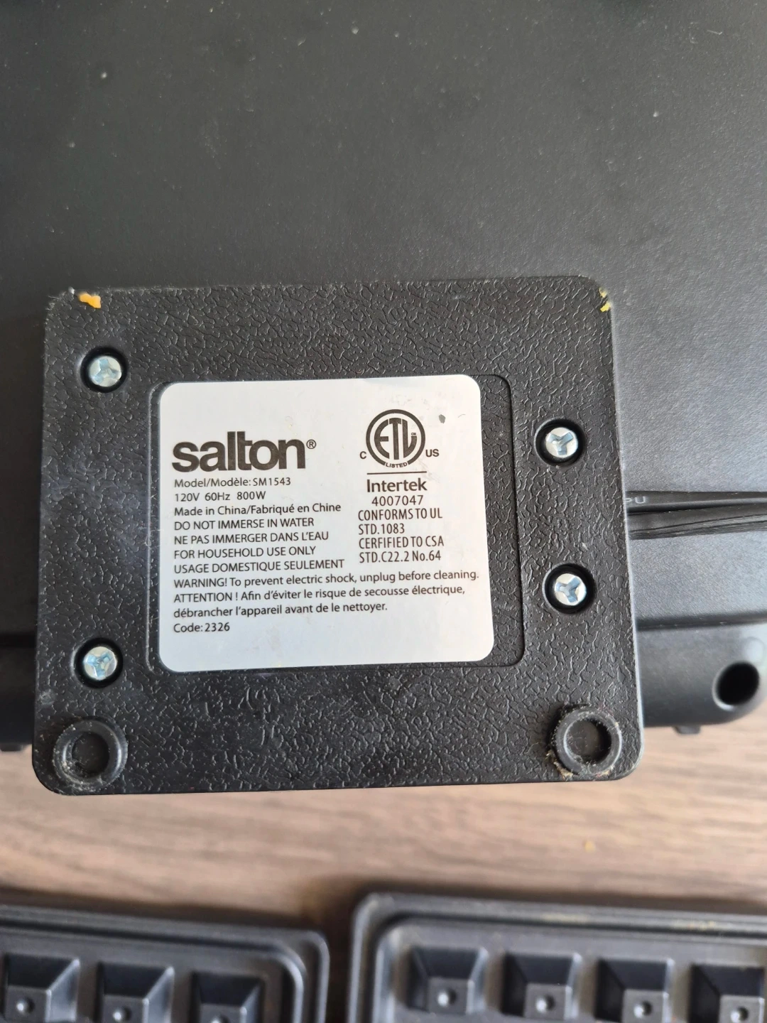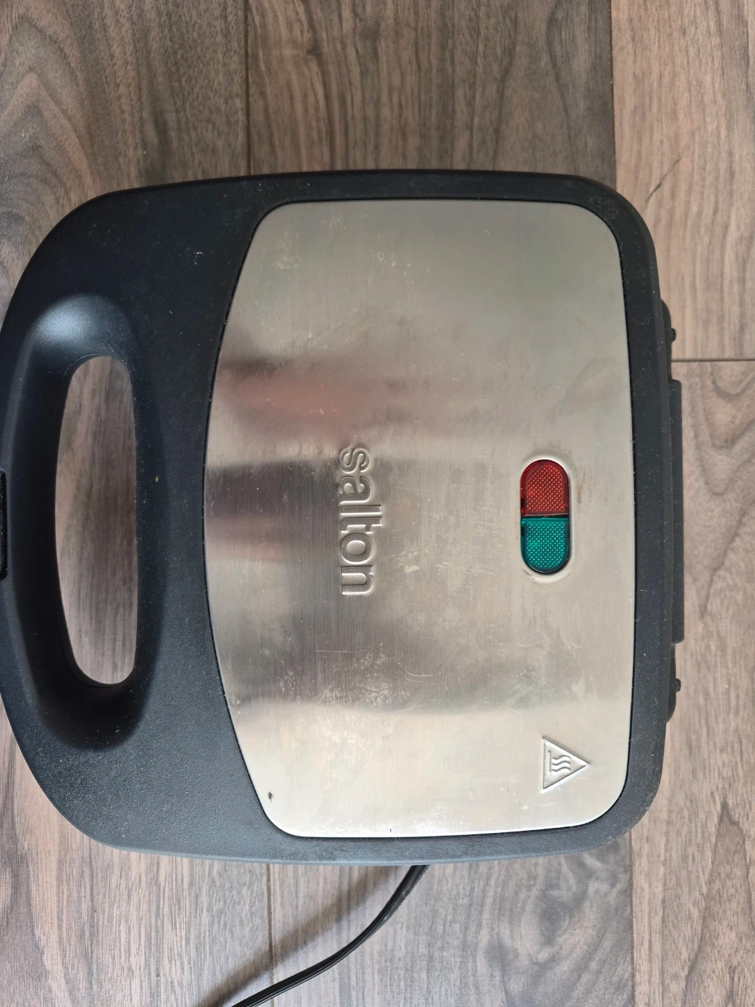 This Salton SM1543 is a versatile sandwich maker, grill, and waffle maker. It comes with four sets of interchangeable plates for different cooking needs. Plate sets include sandwich, grill, and waffle designs.