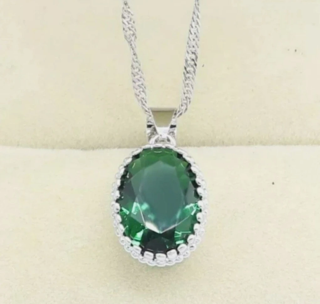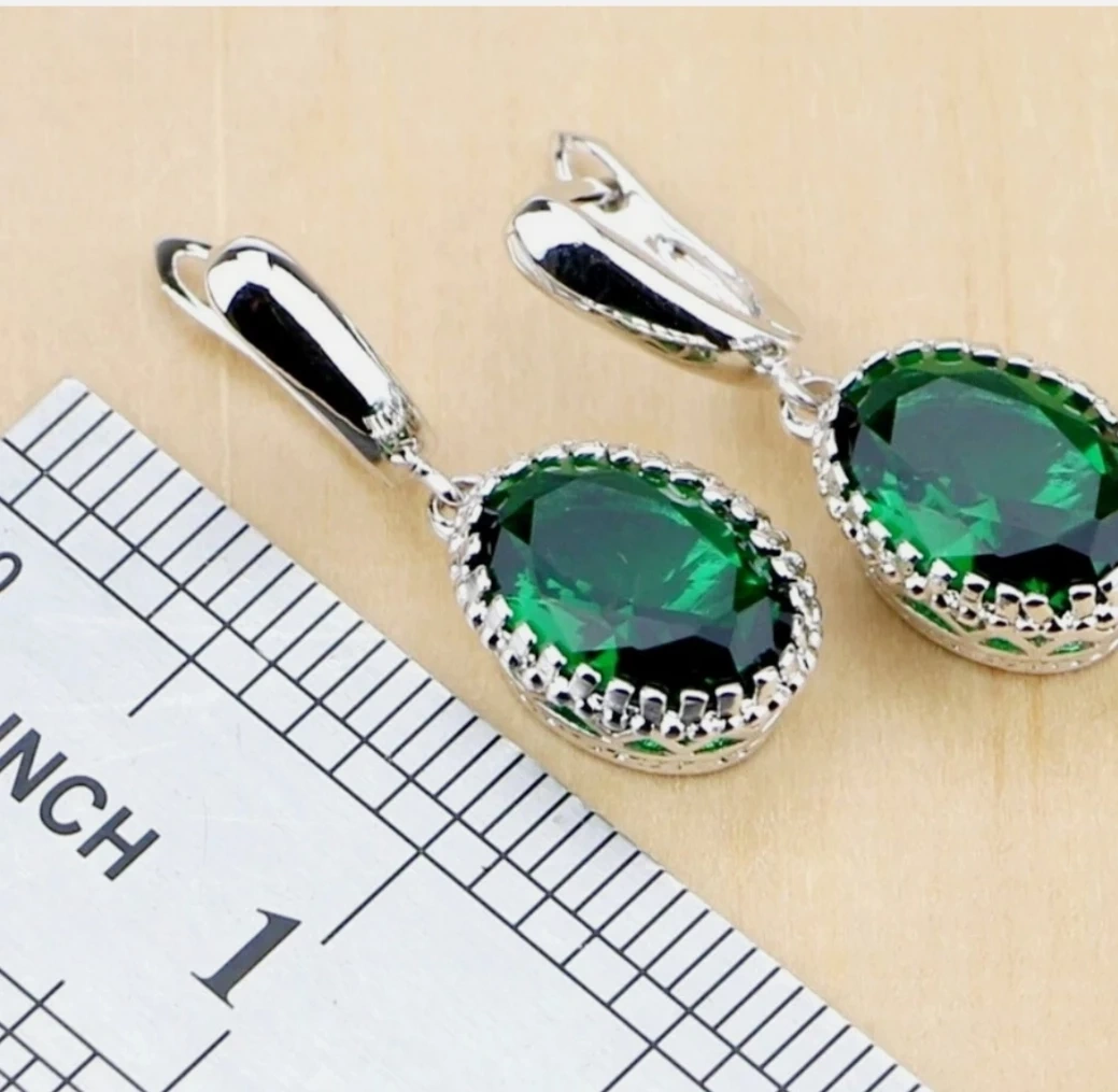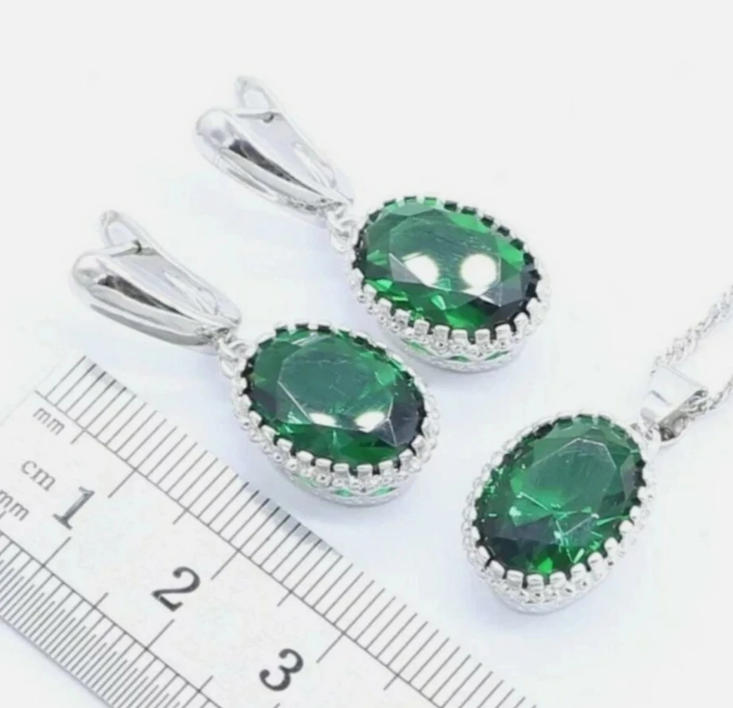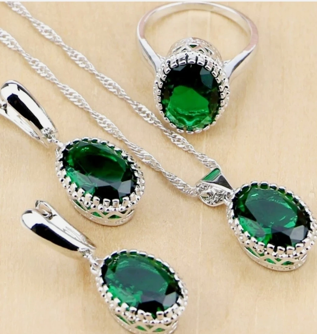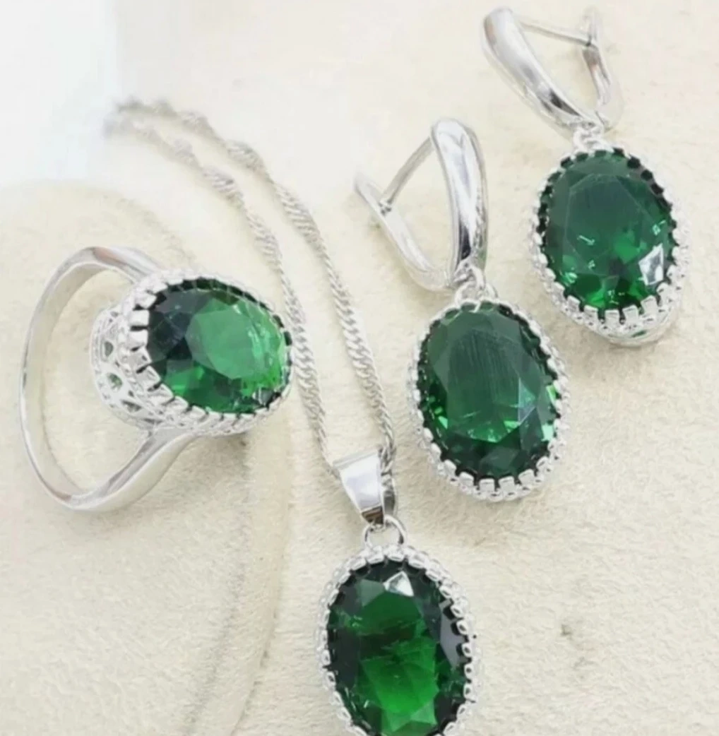 Selling a beautiful jewelry set featuring emerald green stones. The set includes earrings, a necklace, and a ring, all with a lovely 925 silver finish. Perfect for adding a touch of elegance to any outfit!