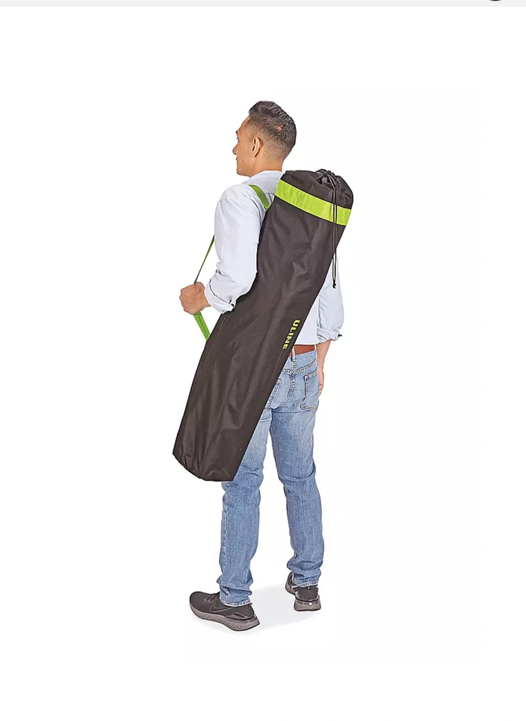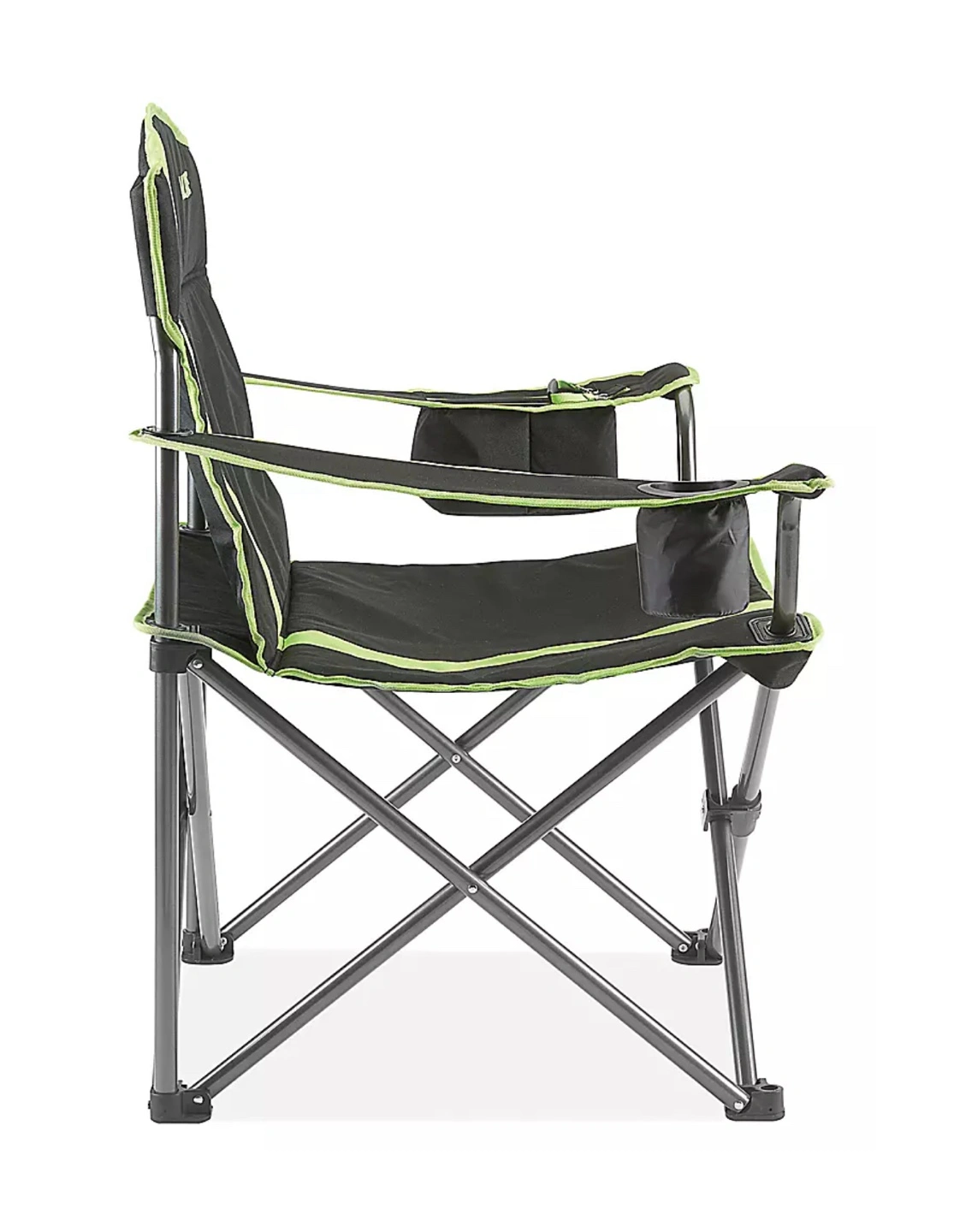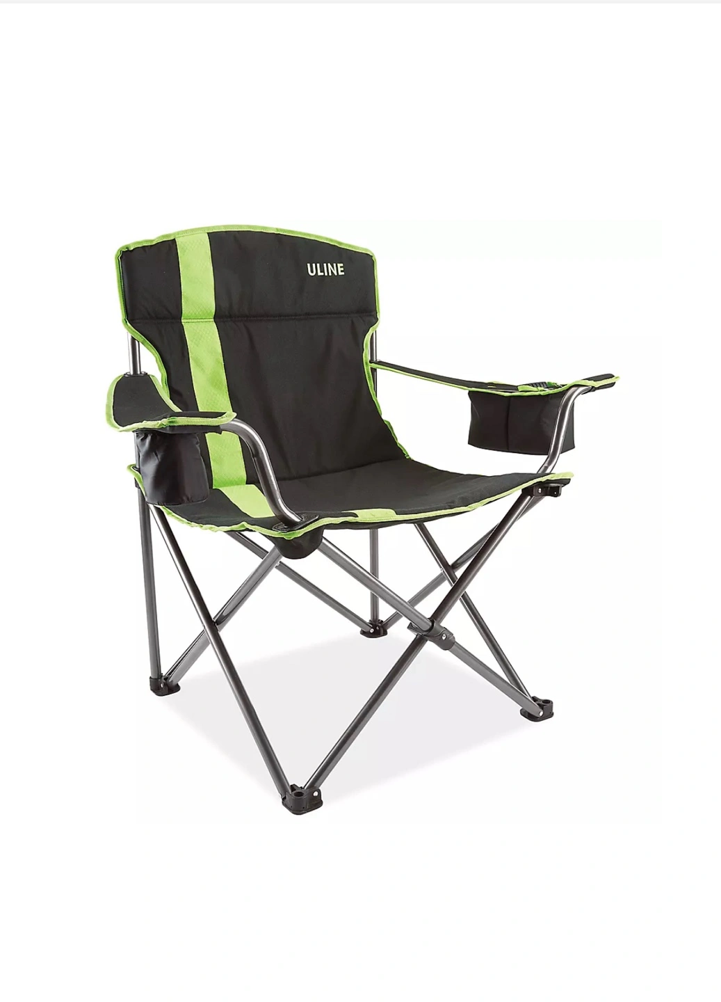 Selling a gently ਨਿਊ Uline folding camp chair. It's in great shape and perfect for camping, picnics, or just relaxing in the backyard. The chair is black with green accents and comes with a convenient carrying bag for easy transport