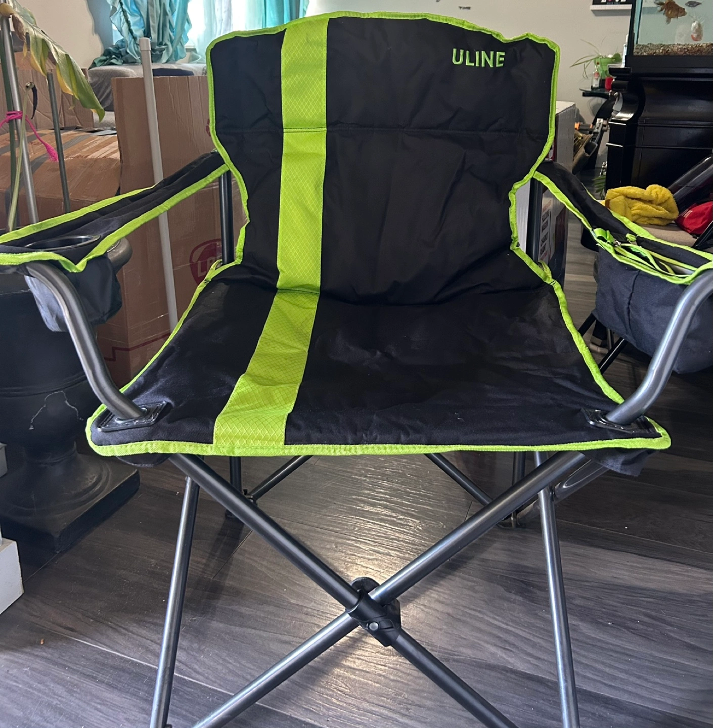 5Black and lime green folding chair. Durable metal frame. Side pockets. Cup holders. Great for camping or outdoor events.