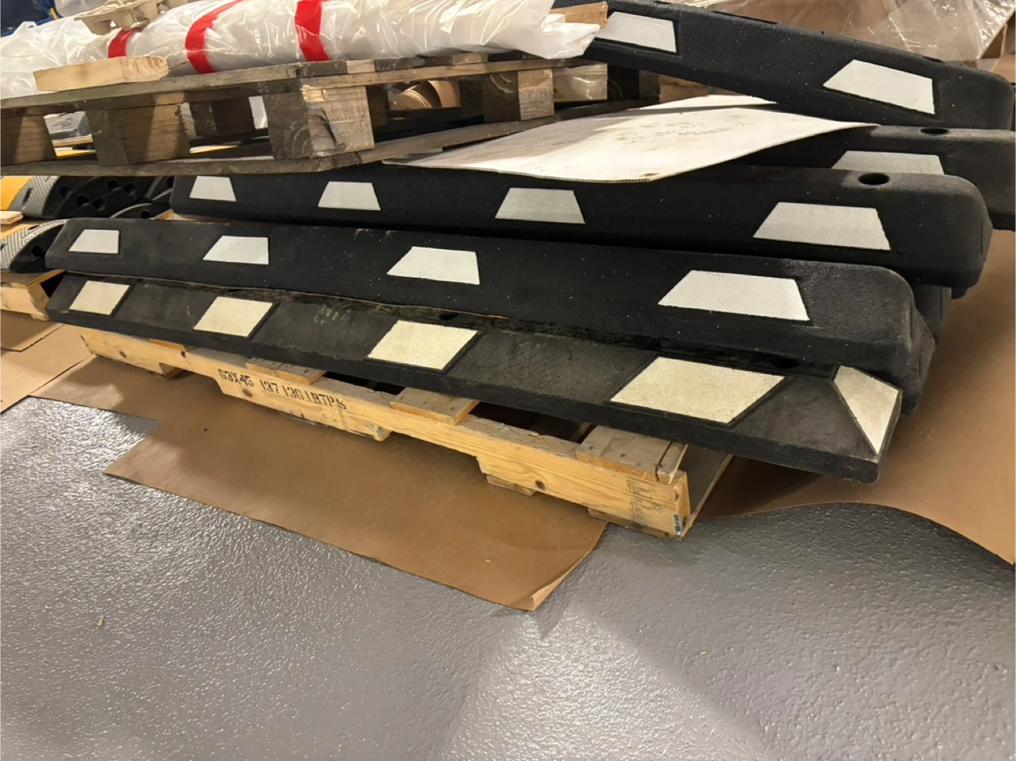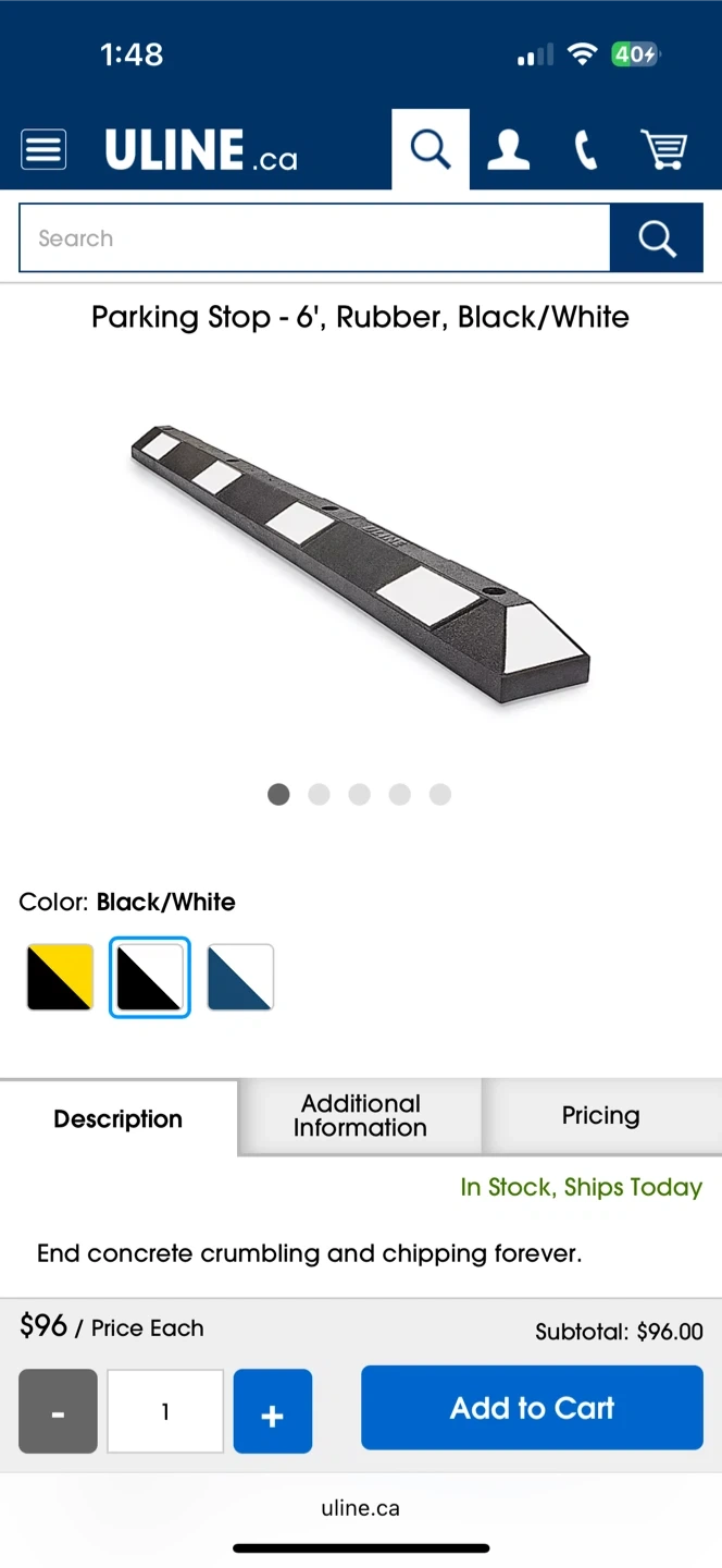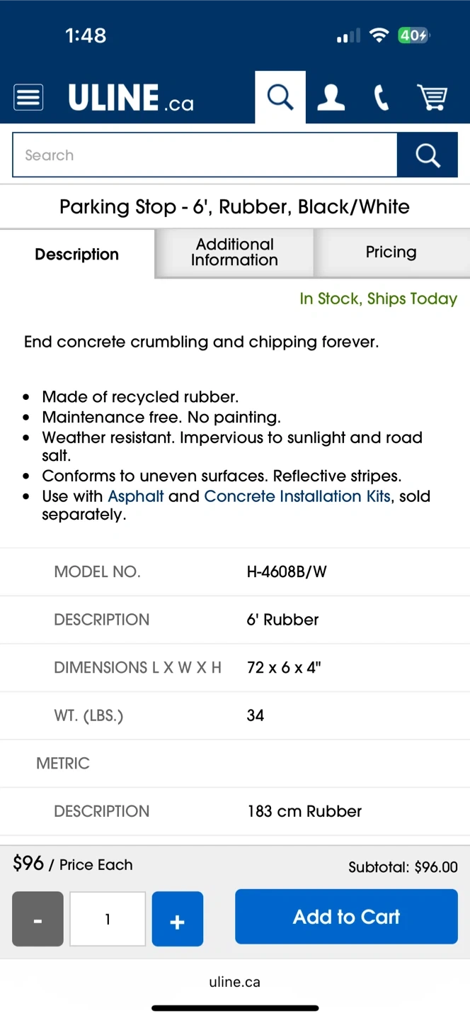 60Selling Uline Commercial Parking Wheel Stops, 6' long, made of rubber, in black and white. It's designed to end concrete crumbling and chipping. Key features: - Made of recycled rubber - Maintenance-free, no painting required - Weather-resistant, impervious to sunlight and road salt - Conforms to uneven surfaces - Has reflective stripes Dimensions are 72 x 6 x 4 inches (183 cm Rubber). Unit weight is 34 lbs (16 kg).