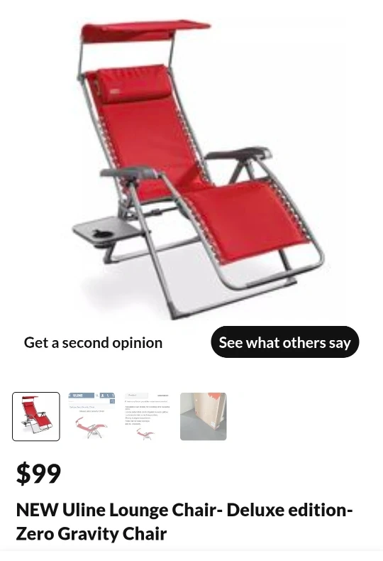 254Selling a gently used Uline Zero Gravity Lounge Chair. It's a super comfy chair for relaxing outdoors. It features a handy side table and adjustable shade. Collapses easily for quick storage. Red color has faded from the sun, but it works perfectly fine and is ready for use!