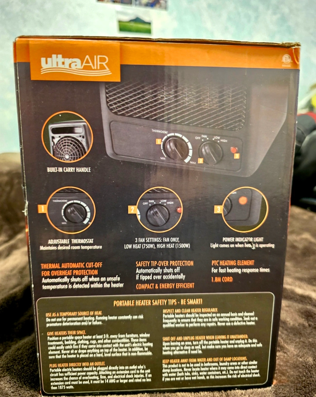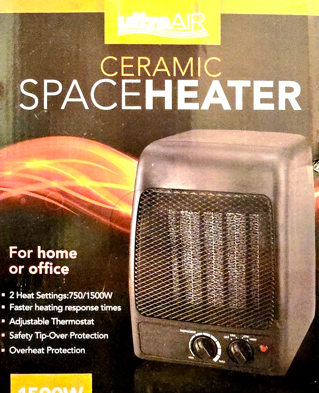 Ceramic space heater. 2 heat settings: 750/1500W. Faster heating response times. Adjustable thermostat. Safety tip-over protection. Overheat protection. Built-in carry handle.