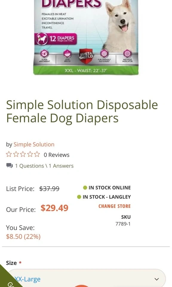 Simple Solution Dog Diapers for Female Dogs, XLarge, 9 Pack - $20.00