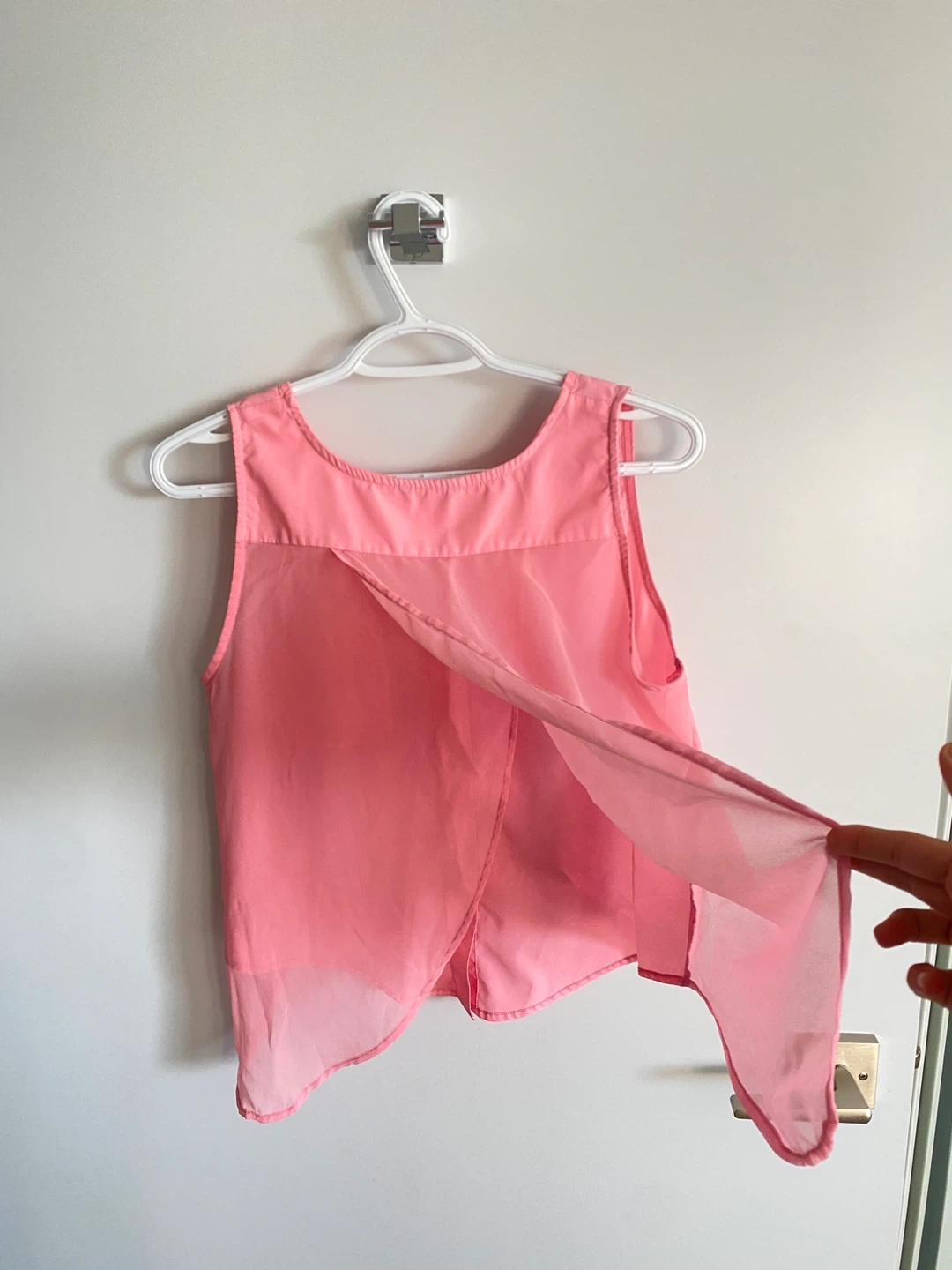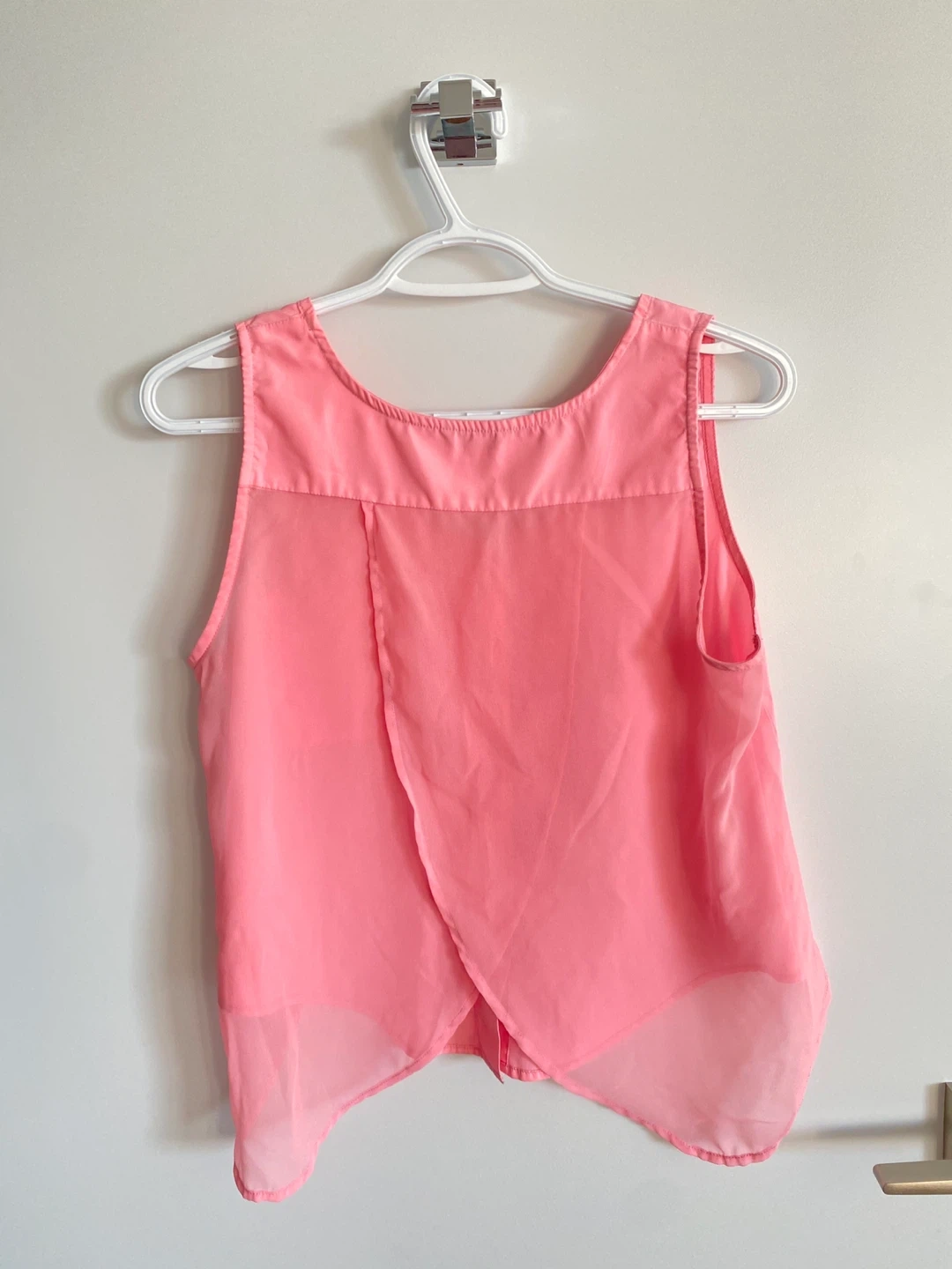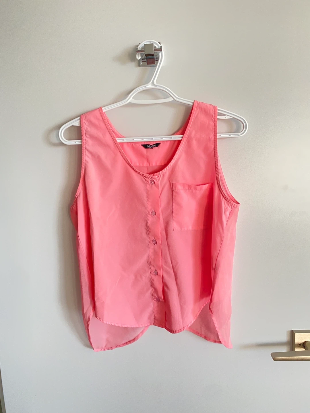 A cute pink sleeveless top. It features a button-up front and a unique open back design. Perfect for summer!