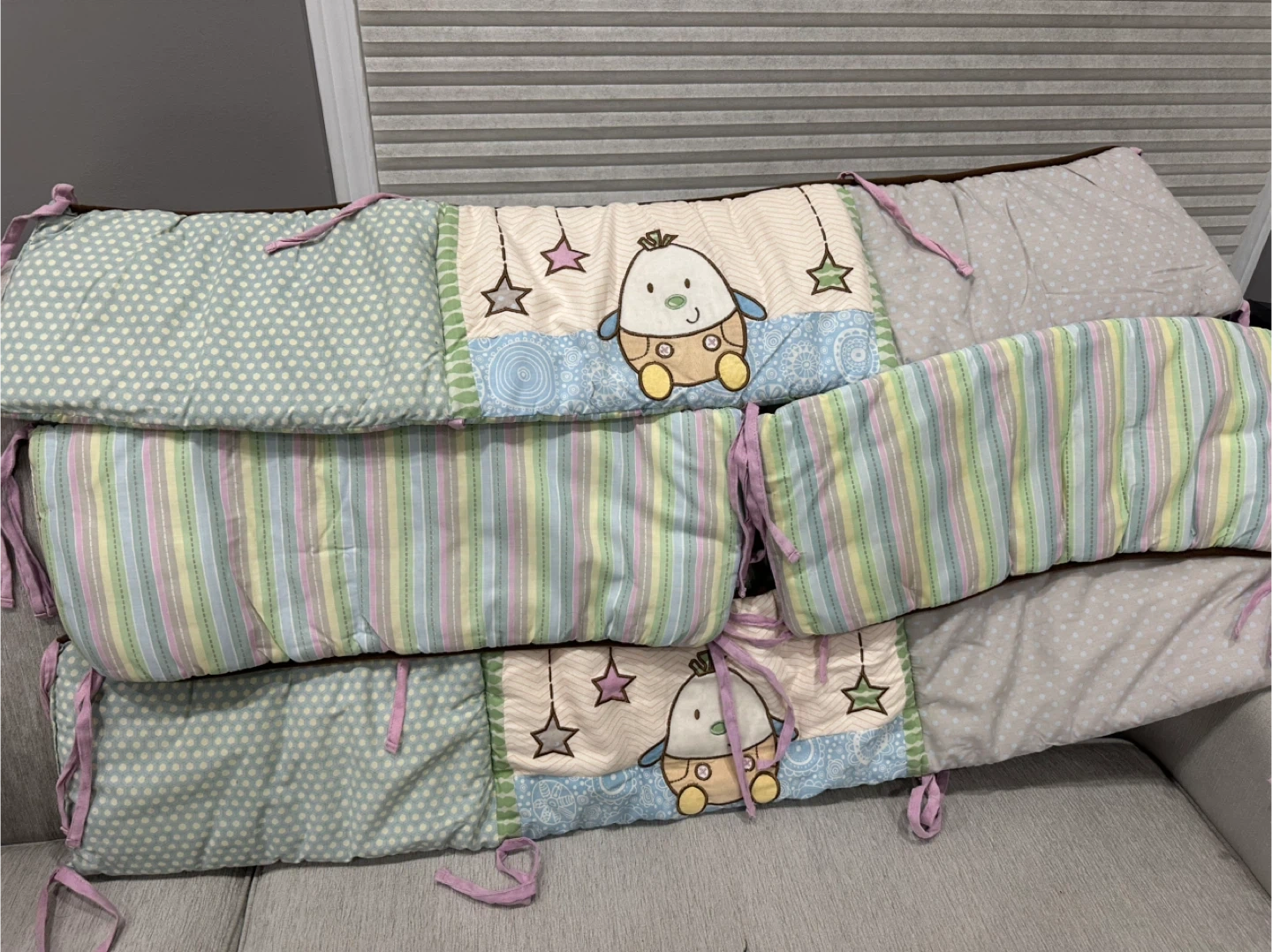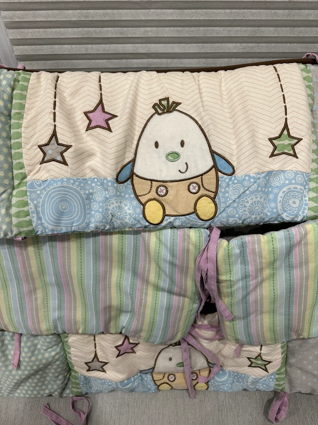 Here's a baby crib bumper pad in good condition! It features a cute bird design with stars. It's perfect for adding a soft and safe touch to your little one's crib.