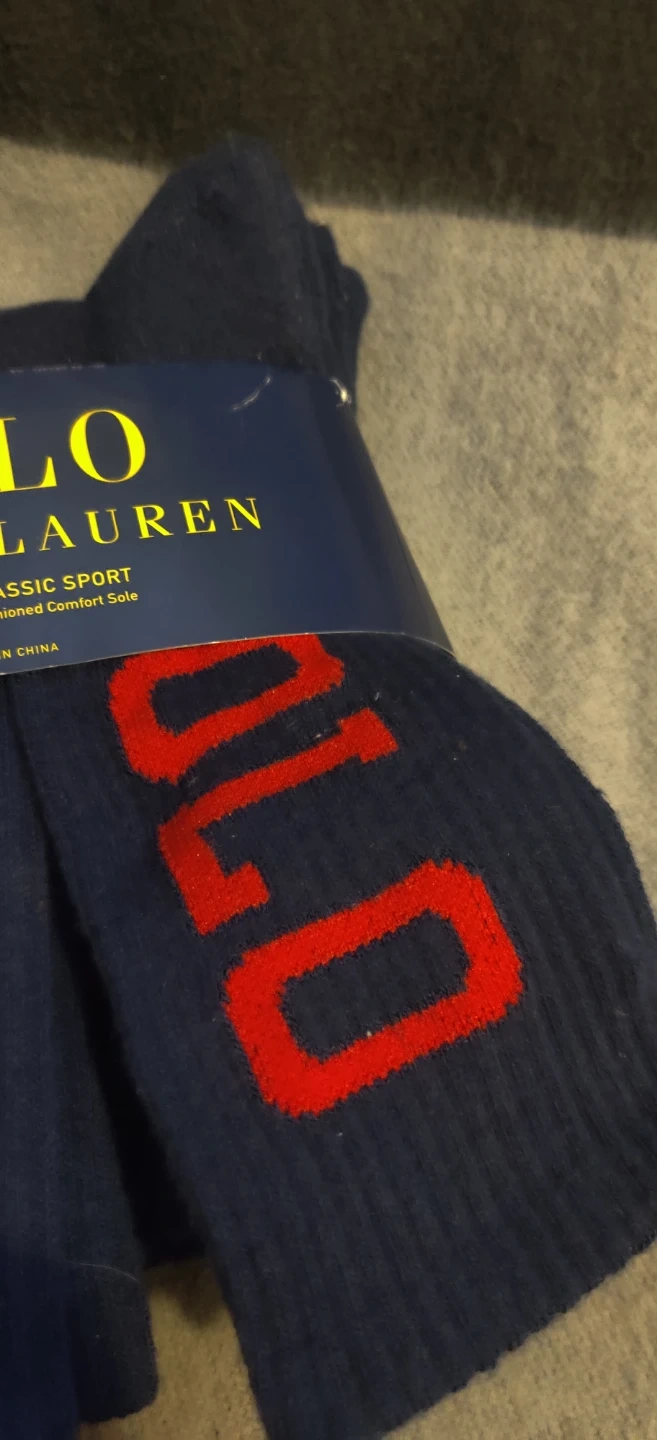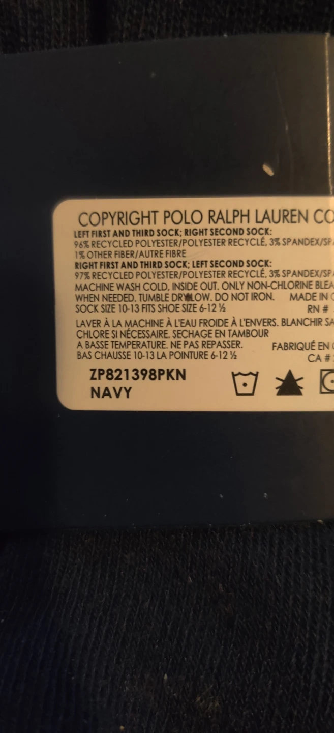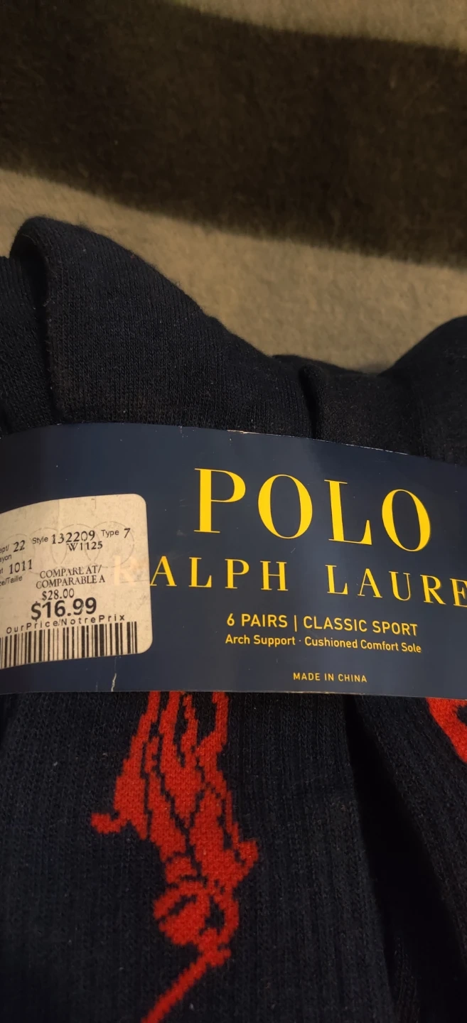 Six pairs of navy blue Polo Ralph Lauren classic sport socks. These socks offer arch support and a cushioned comfort sole. Shoe size 6-12.5