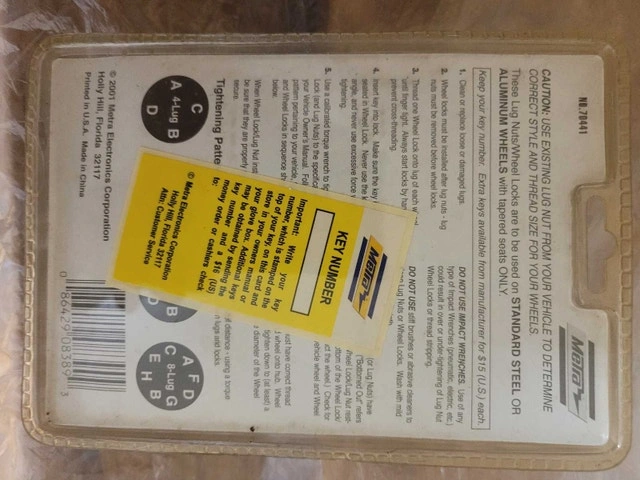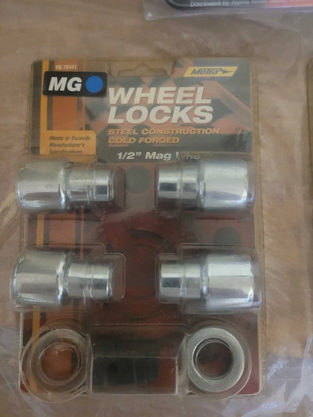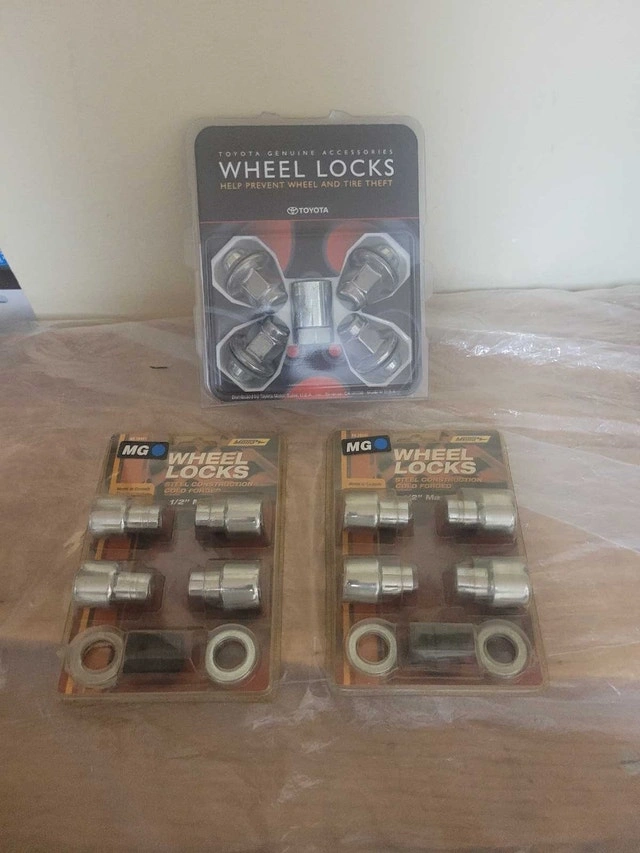 For sale we have these 3 x New Wheel Lock. 1 set for Toyota Manufacturer Toyota Model 00276-00900 Manufacturer part number 00016-99115 on sell on Amazon for $168.37 and set of MG Metra 1/2" Mag Wheel product no. 70441 asking $150.00 for the lot pick up on beaverbrook lane Kanata thank you