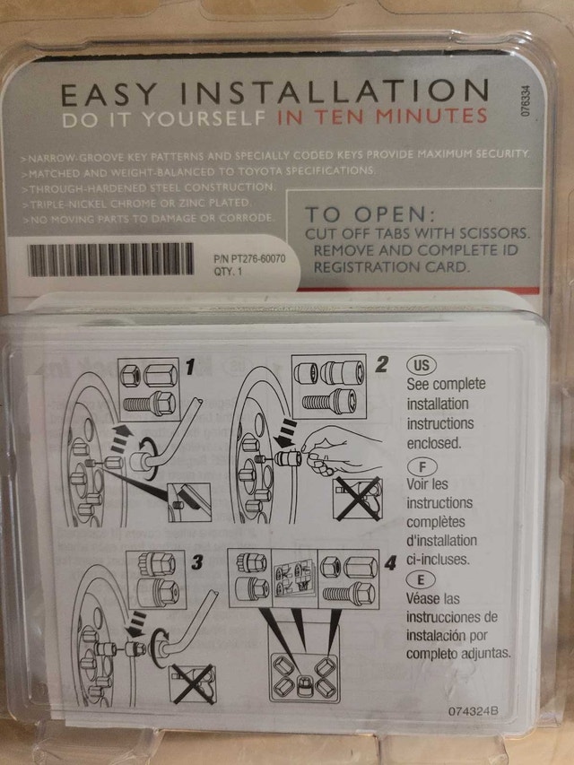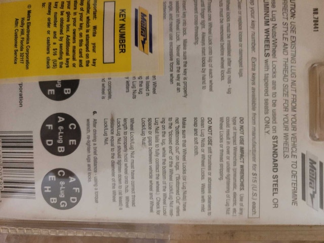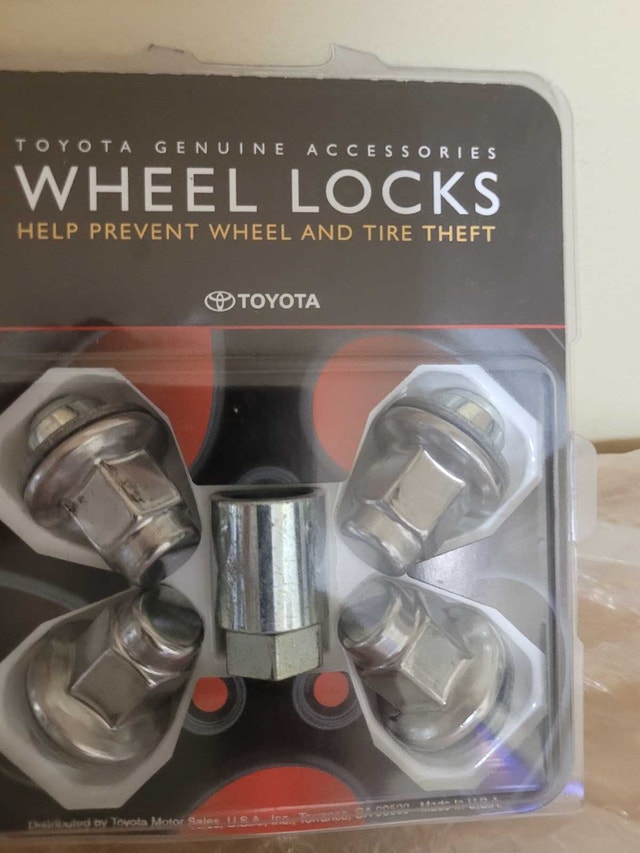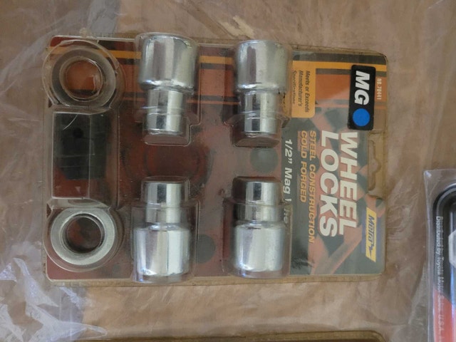 For sale we have these 3 x New Wheel Lock. 1 set for Toyota Manufacturer Toyota Model 00276-00900 Manufacturer part number 00016-99115 on sell on Amazon for $168.37 and set of MG Metra 1/2" Mag Wheel product no. 70441 asking $150.00 for the lot pick up on beaverbrook lane Kanata thank you
