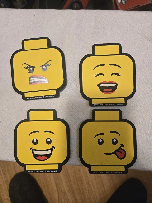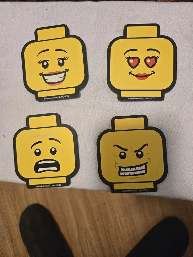 Add a touch of Lego fun to your space with these Lego VIP Coasters! This set of 4 is in new condition, featuring fun Lego head emoji designs. Perfect for protecting your surfaces with a playful twist. They are double sided, made of rubber. These delightful coasters are looking for a new home and are ready to bring a smile to your face every time you use them. If the ad is up, they're available!