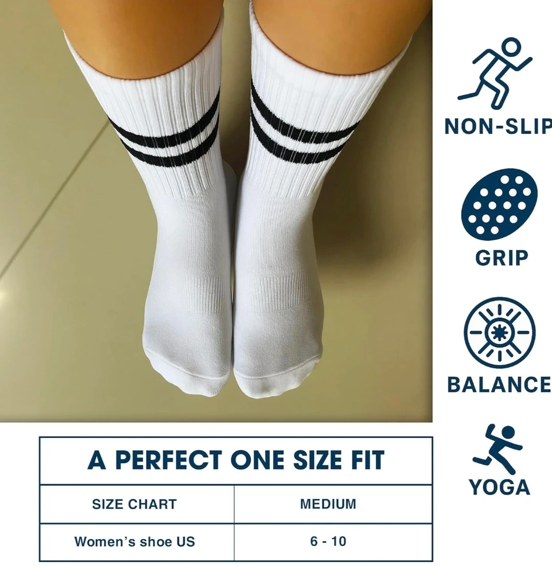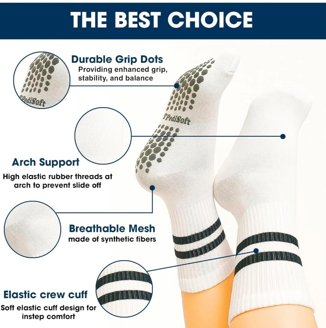 These TPediSoft crew socks come in a convenient 4-pair pack. They're made with breathable mesh and feature durable grip dots for enhanced stability. A perfect one-size-fits-most design, suitable for women's shoe sizes 6-10. They're great for yoga, home, or workouts!