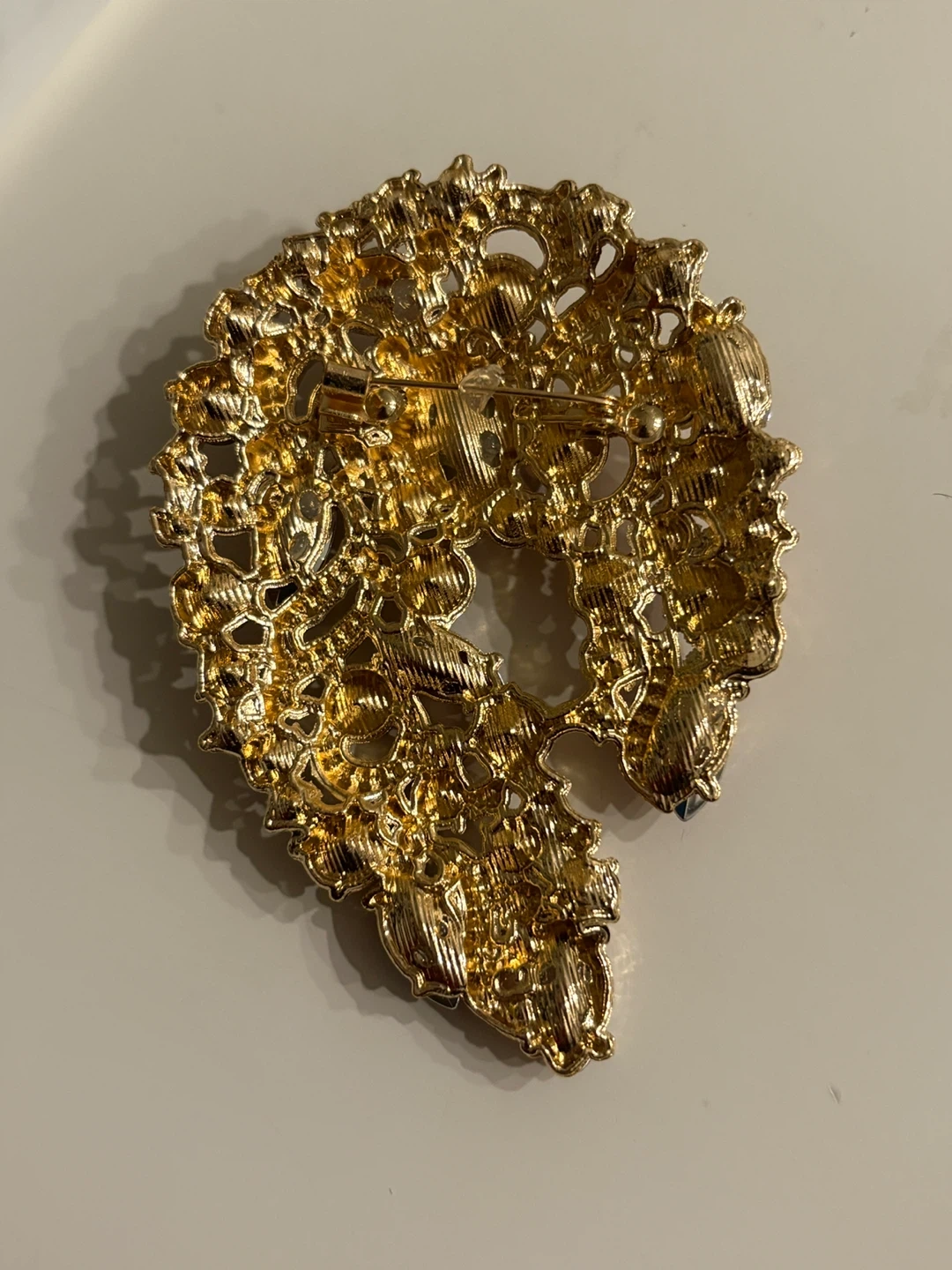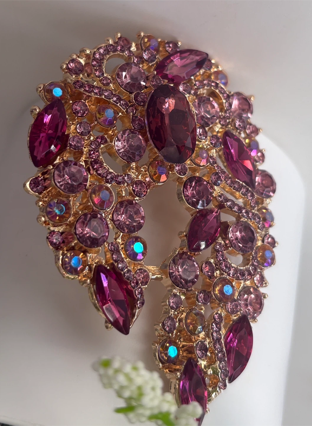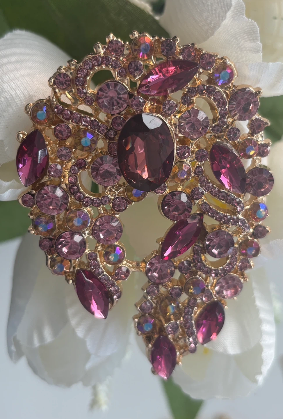 Beautiful gold-tone brooch embellished with various shades of pink and purple crystals. It features an intricate, ornate design with a mix of marquise and round-cut stones. This piece adds a touch of sparkle and elegance to any outfit!